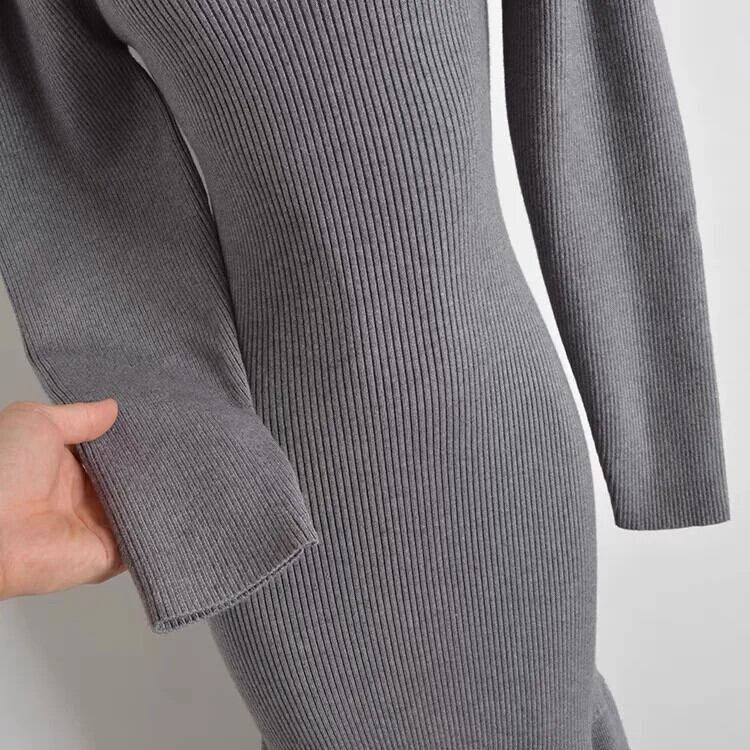 Pinkoz デザイナードレスグレーニット o ネック長袖フリルマキシ秋冬ドレスセーターカジュアルエレガント Vestidos ロング ピンク ラッフル オータム 秋物 ウィンター 冬物 Oネック