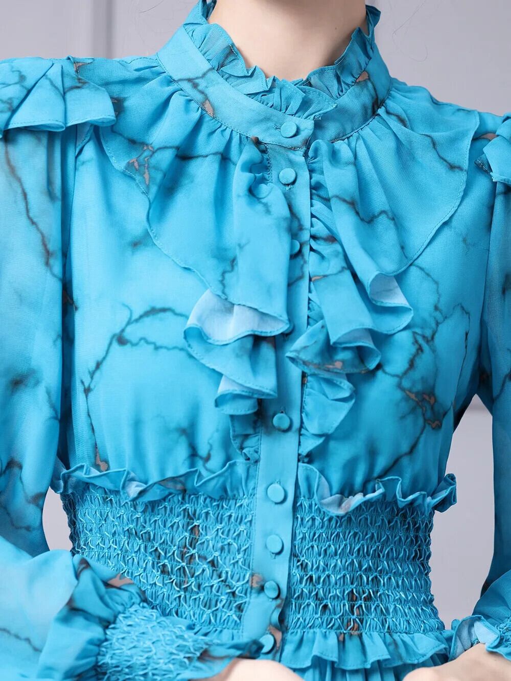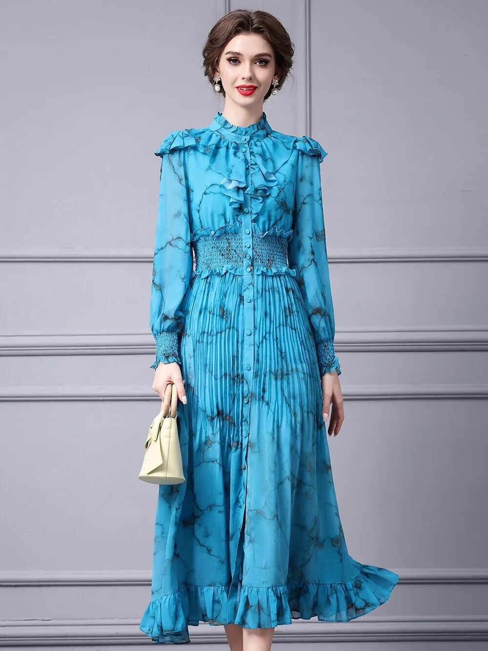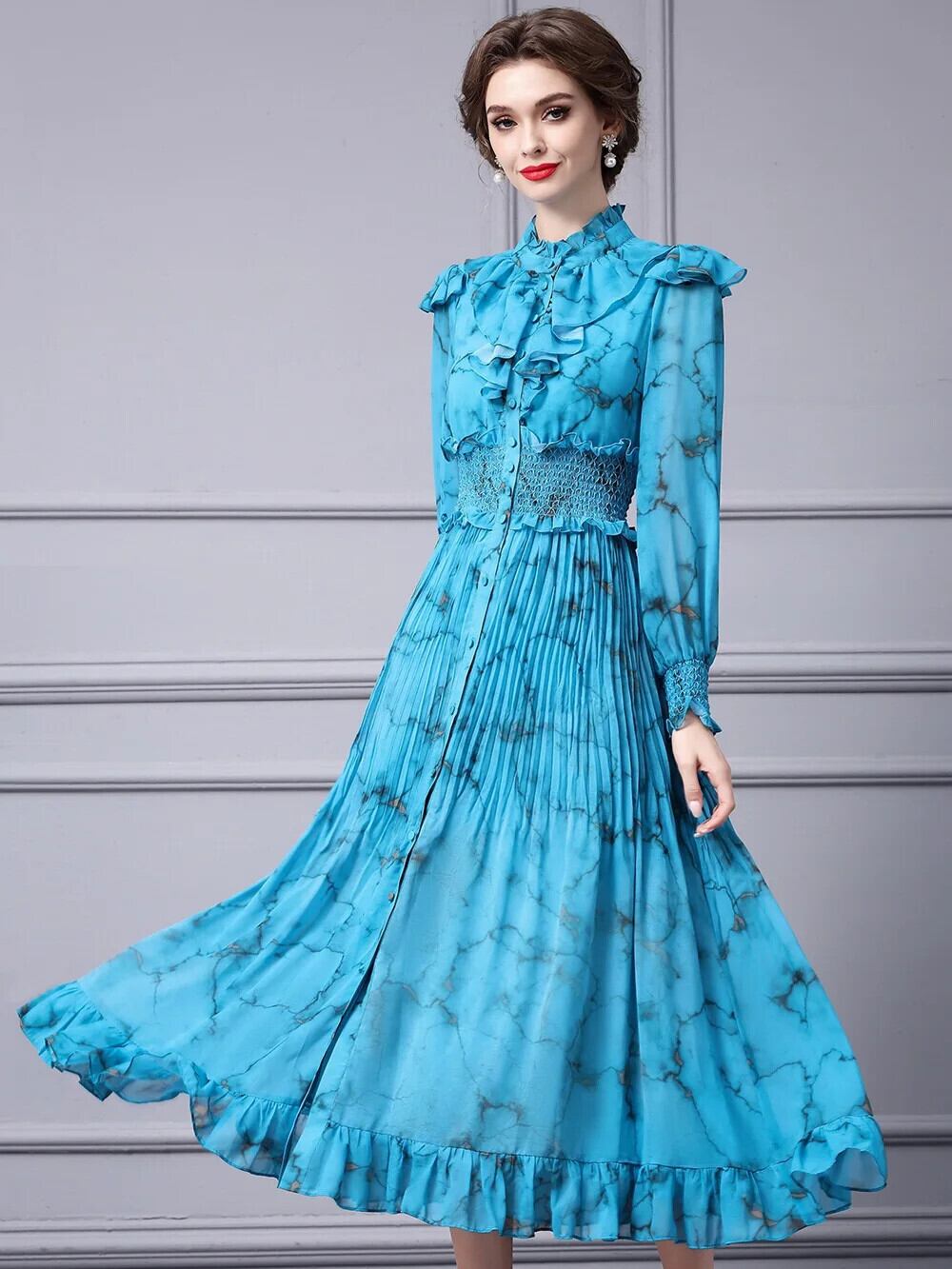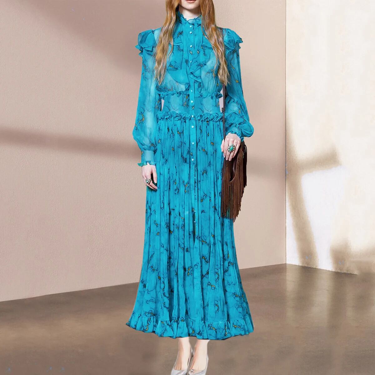 Pinkoz 滑走路デザイナーブルー花柄スタンドカラーシャーリング弾性ウエスト A ラインフリルパーティーマキシドレスヴィンテージディナー za ピンク ラッフル エラスティック 伸縮 Aライン ビンテージ