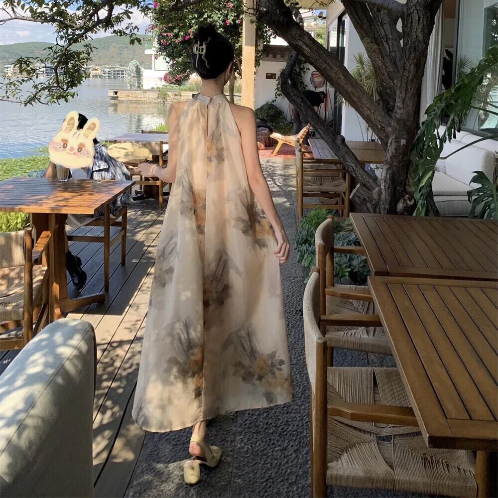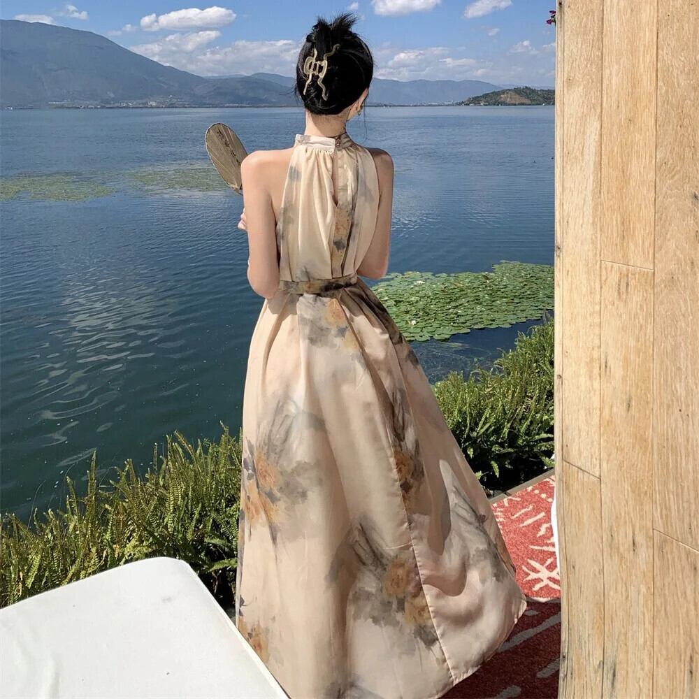 Pinkoz ヴィンテージホルター花柄プリントレースアップホリデーサマーミディロングドレスタンクノースリーブ Vestidos ピンク 夏物 ビンテージ