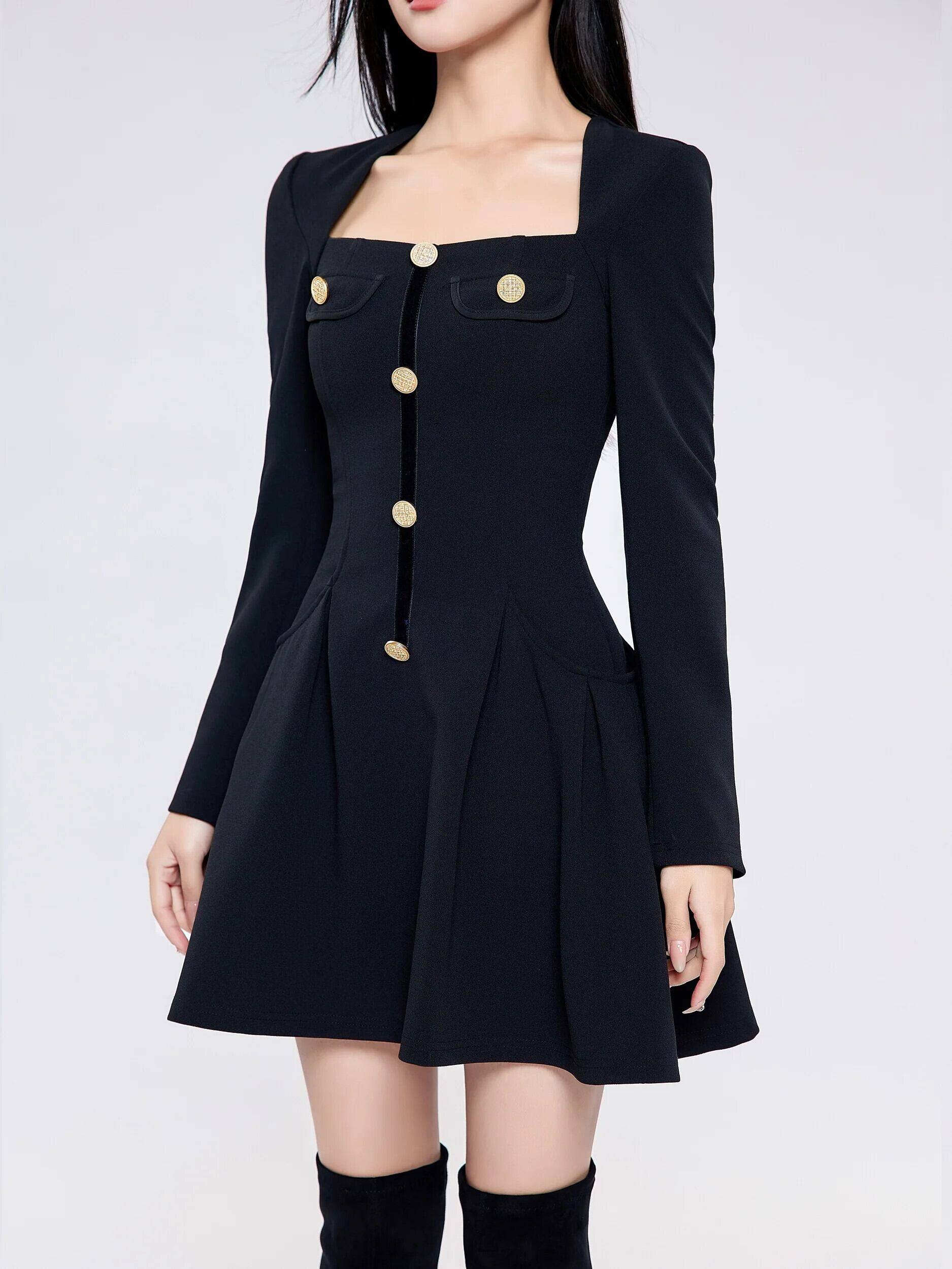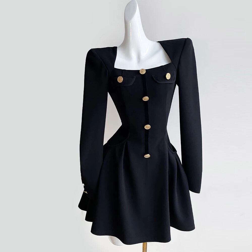 Pinkoz 滑走路デザイナースタイリッシュ黒人ドレススクエアカラー長袖シングルブレストボタンパーティー Vestidos ヴィンテージ ロング ピンク ブラック スクウェア ビンテージ
