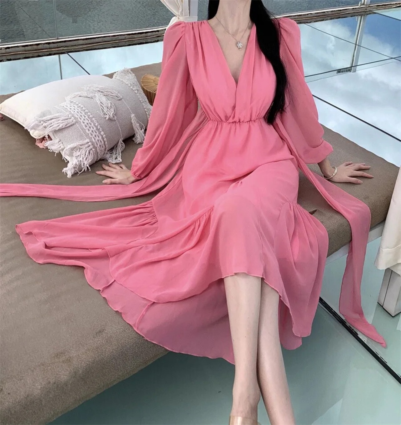 Pinkoz ピンク甘いかわいいピンクミディドレスフリル長袖シフォン春夏レースアップサッシ不規則パーティーナイトドレス za ロング ラッフル 大人ガーリー スウィート キュート カジュアル スプリング 春物 サマー 夏物