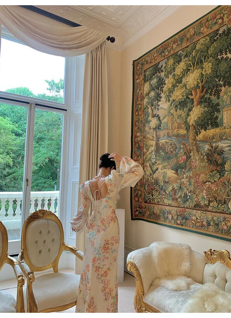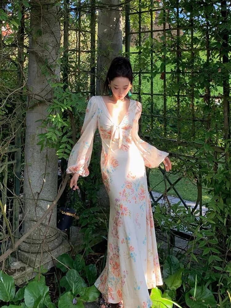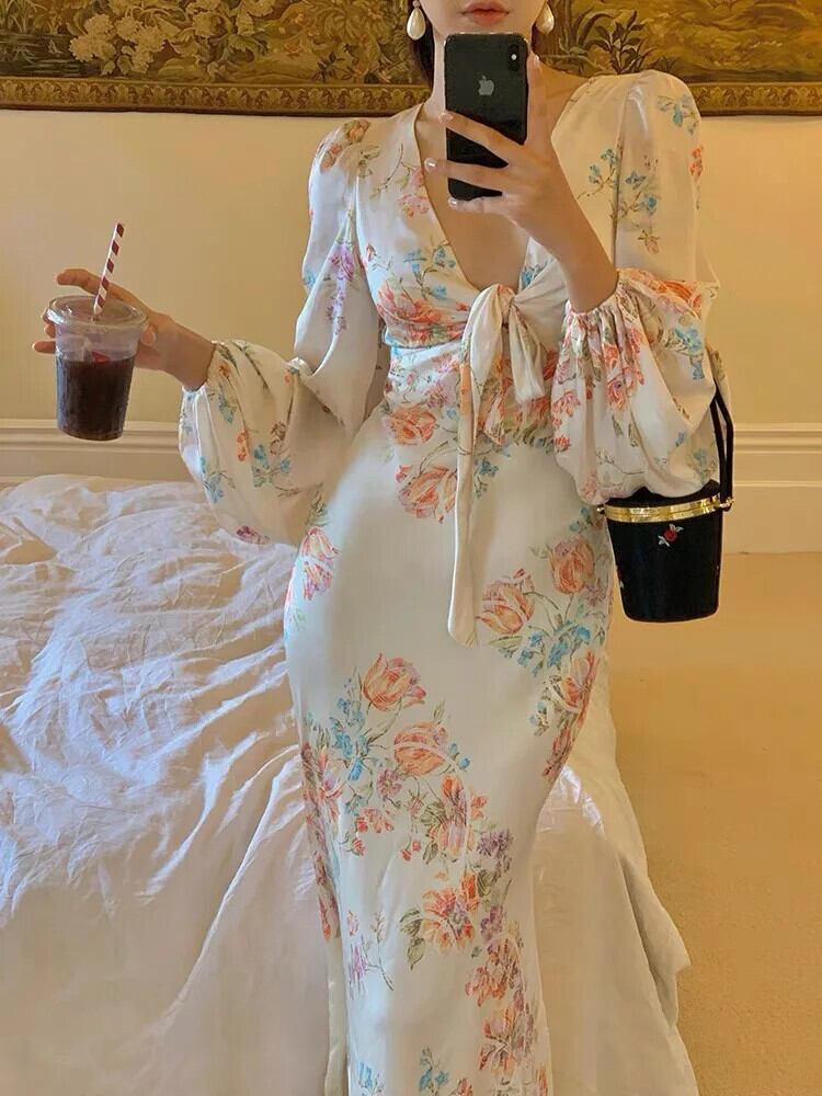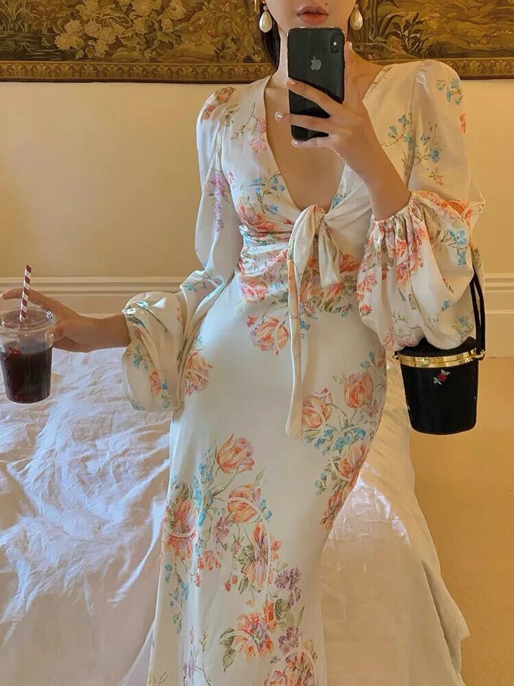 Pinkoz 滑走路デザイナー V ネック弓花柄プリントぬるぬるマキシドレスパーティーナイトセクシーヴィンテージ Vestidos エレガント ピンク リボン Vネック ビンテージ