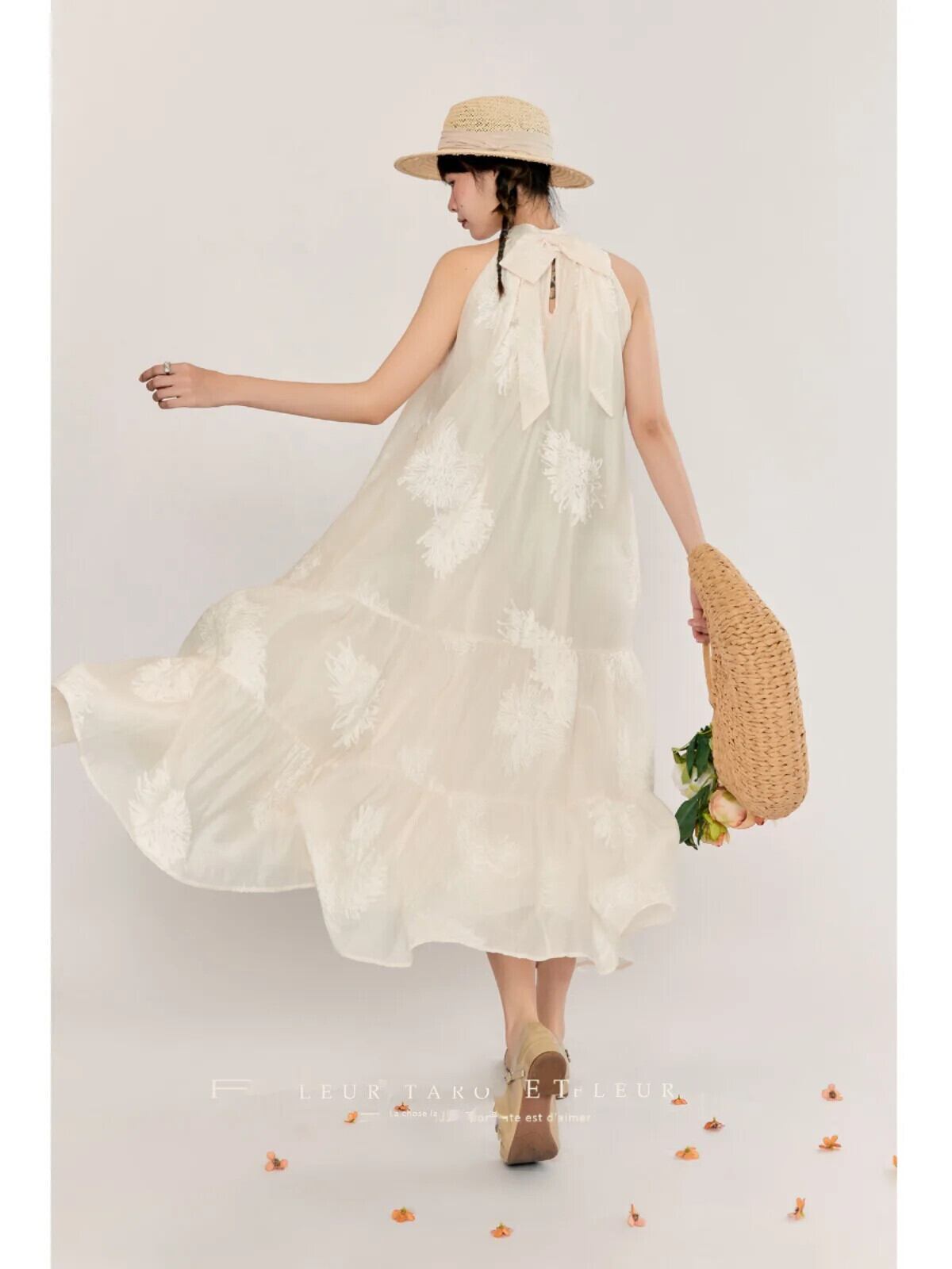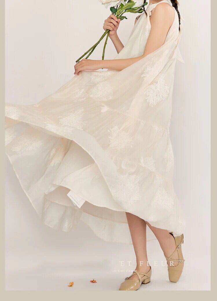 Pinkoz ヴィンテージホルターミディドレスベージュ刺繍ノースリーブルーズ A ラインドレス若いフレンチシックホリデーローブデムジェ ピンク Aライン ビンテージ