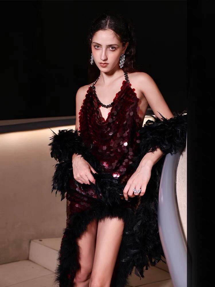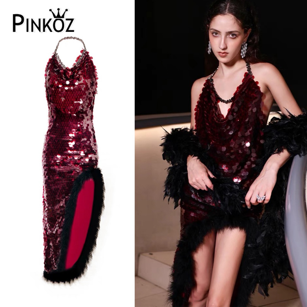 Pinkoz 赤滑走路デザイナースタイリッシュホルタースパンコールミディパッチワーク毛皮不規則ドレスクリスタル高級誕生日パーティードレスローブ ピンク レッド
