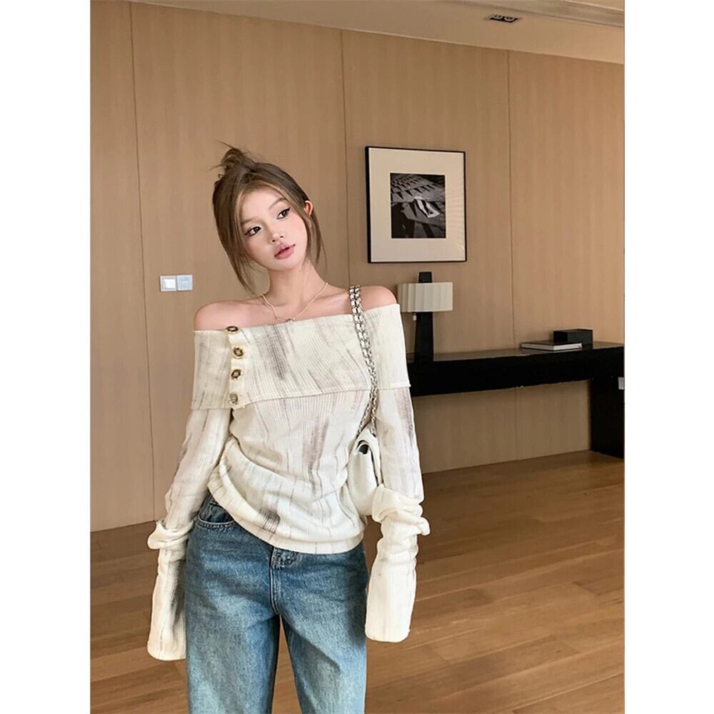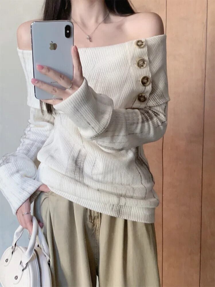 Pinkoz 秋冬ナイトスラッシュネックボタン不規則ニットストリートファッションヴィンテージローブ za ピンク オータム 秋物 ウィンター 冬物 ビンテージ