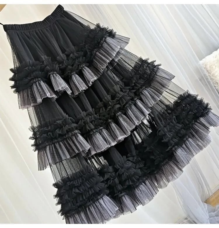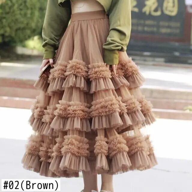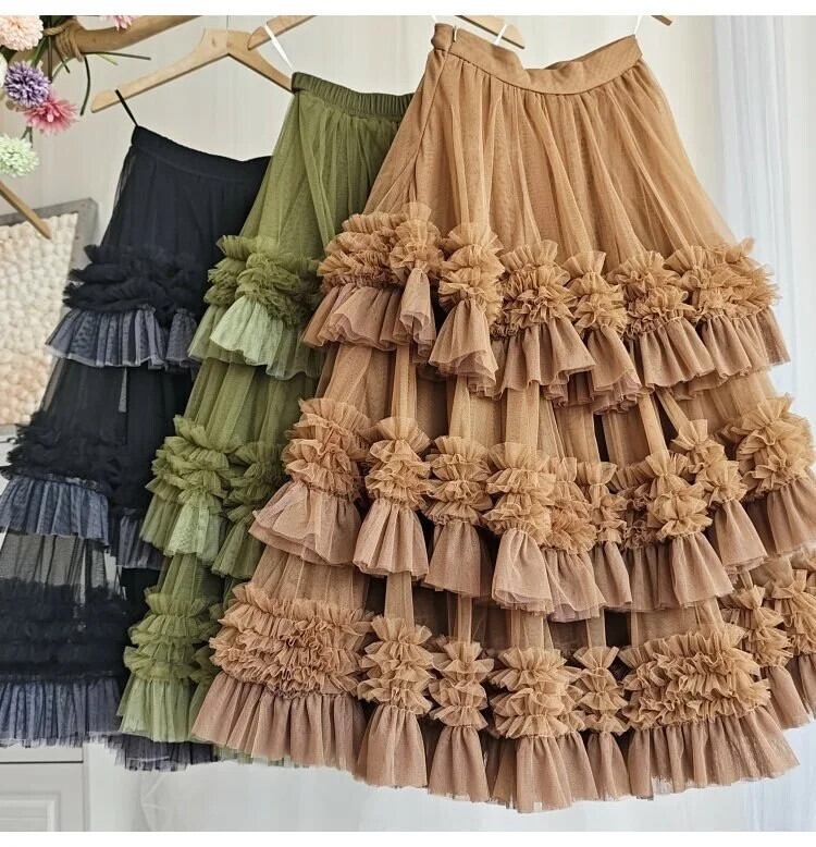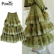 Pinkoz 滑走路デザイナーハイウエストパーティー高級ヴィンテージフレンチシックグリーンメッシュフリルカスケードレイヤードスカートファルダローブ ハイウェスト ピンク レッド ラッフル ビンテージ