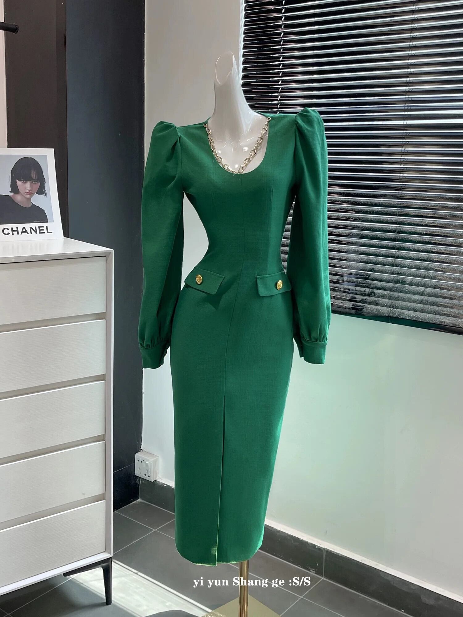 Pinkoz ヴィンテージミディペンシルドレスグリーンポケットボタンメタルチェーンスクエアカラーランタンスリーブロングドレスvestidosローブ ピンク スクウェア ビンテージ