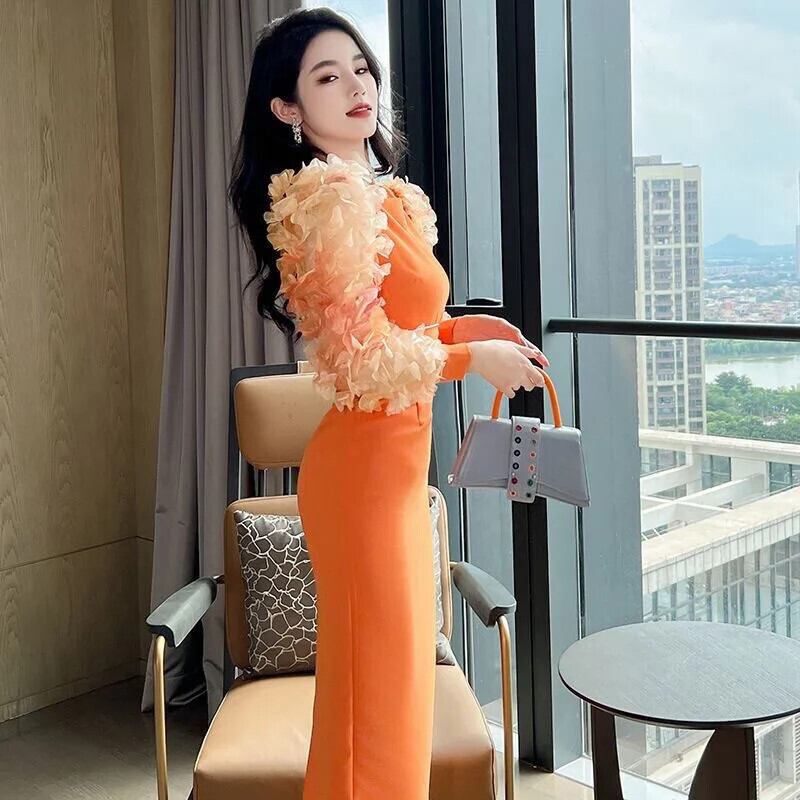 Pinkoz 滑走路デザイナーペンシルミディドレススクエアカラーランタンスリーブパッチワークレースクリスタルビーズオレンジvestidosヴィンテージ ピンク スクウェア ビンテージ