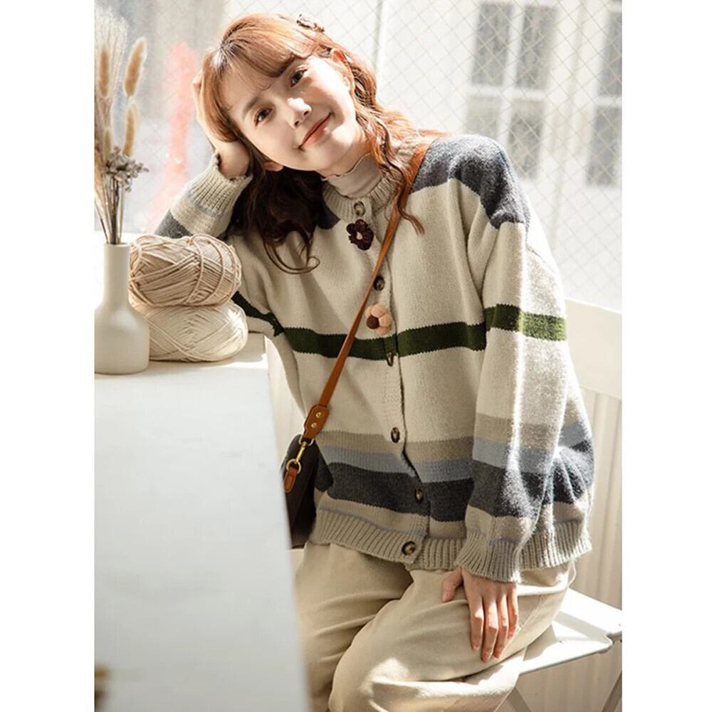 Pinkoz 森スタイリッシュストライプルーズカーディガンファッションカジュアルシングルブレストボタンヴィンテージニットジャケット ピンク ビンテージ