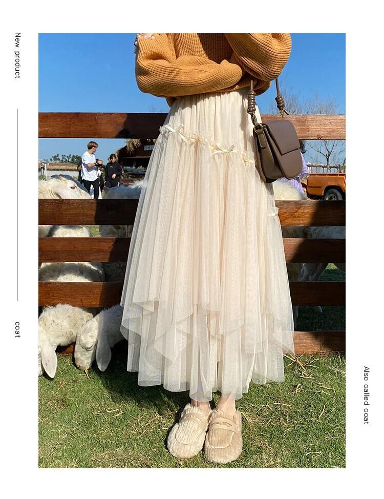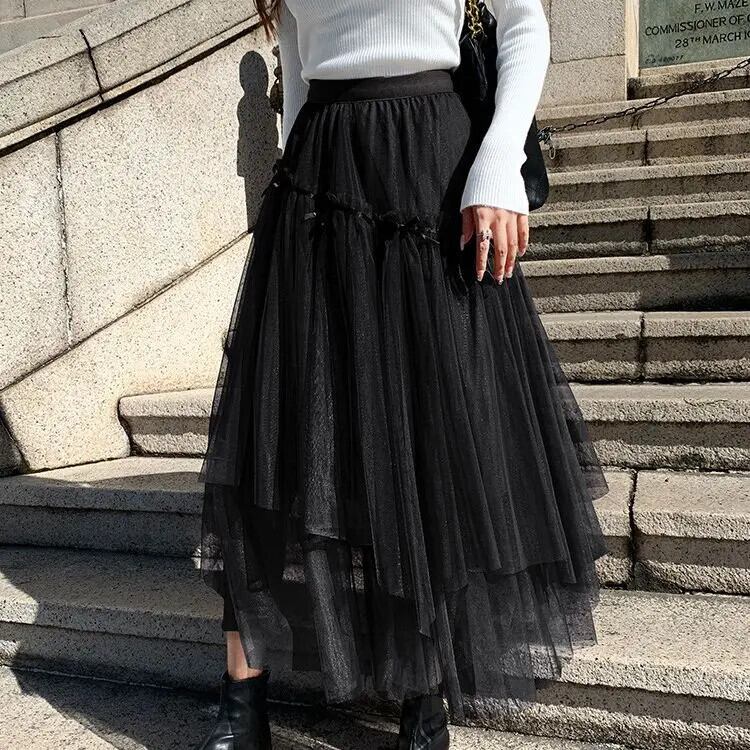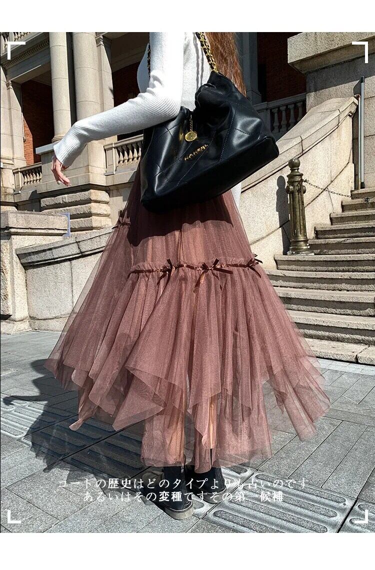 Pinkoz ファッションミディメッシュ不規則弓ハイウエストブラウンスカート非対称カジュアルエレガントヴィンテージスカートファム · デ · mujer ハイウェスト ピンク リボン フェミニン ビンテージ