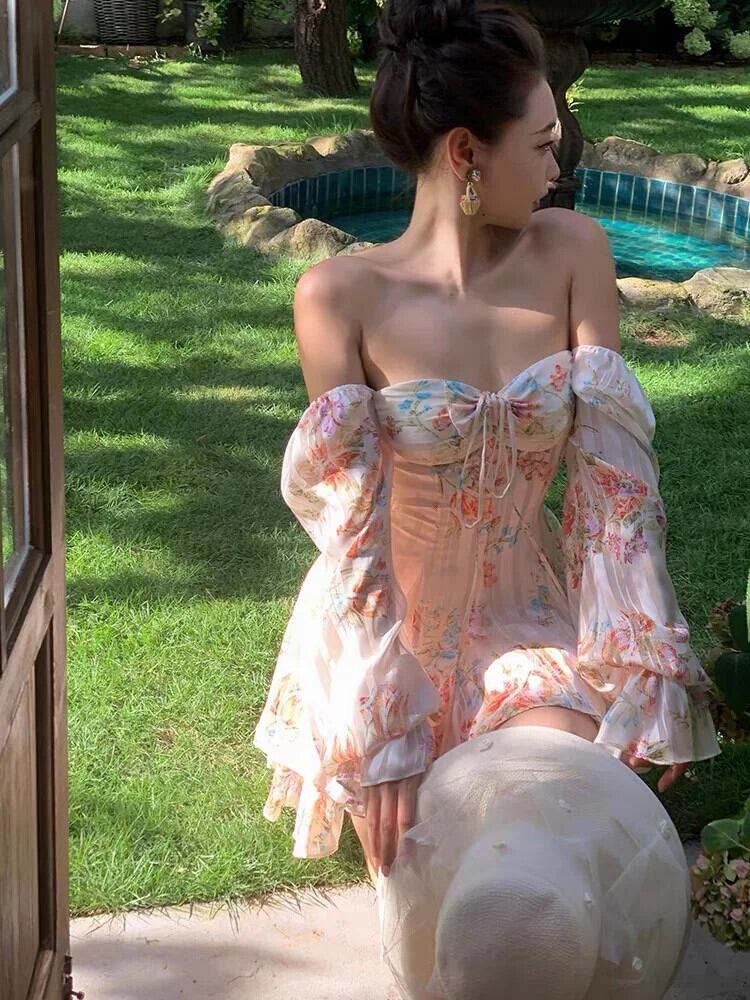 Pinkoz ヴィンテージ オフショルダー スラッシュ ネック シフォン 花柄 プリント シャーリング ミニ ドレス y2k ベスト ローブ フレンチ ピンク ビンテージ