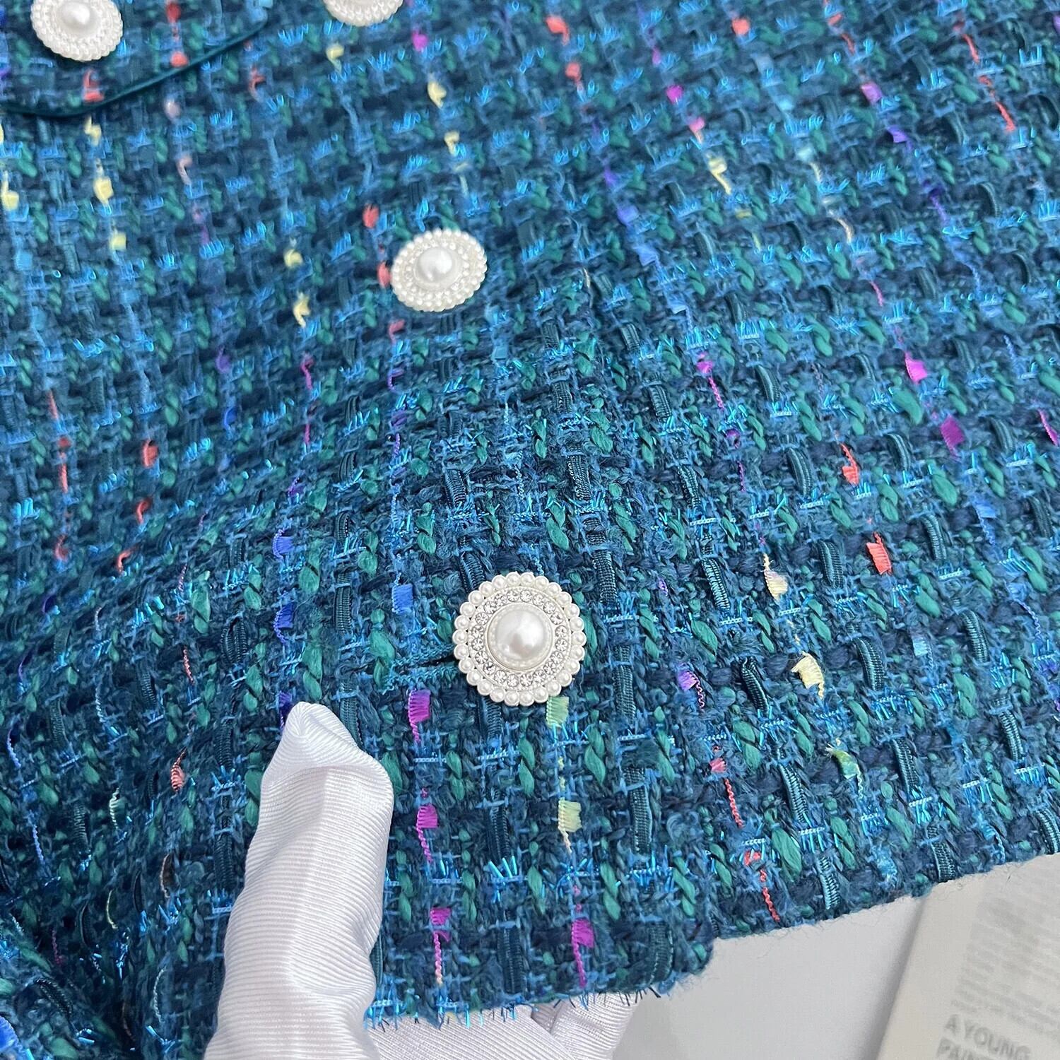 Pinkoz 滑走路デザイナー ブルー ツイード エレガントショート ジャケット シングルブレスト ボタン オフィス レディー秋冬オーバーコート ヴィンテージ ローブ ピンク オータム 秋物 ウィンター 冬物 ビンテージ 会社 学校 通勤や通学にも