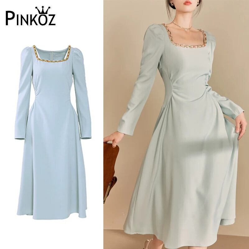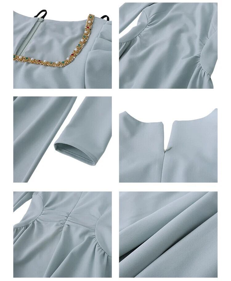 Pinkoz 滑走路デザイナーライトブルークリスタルビーズ o ネックシャーリング A ラインミディドレスヴィンテージフレンチシック Vestidos traf ピンク Oネック Aライン ビンテージ