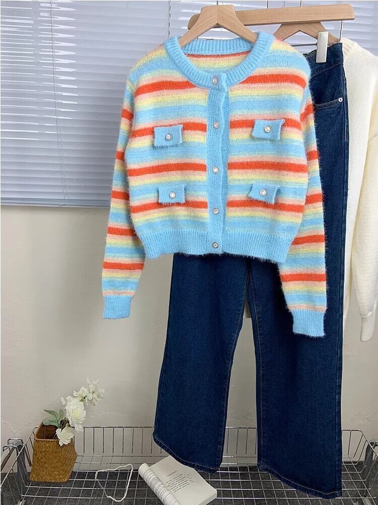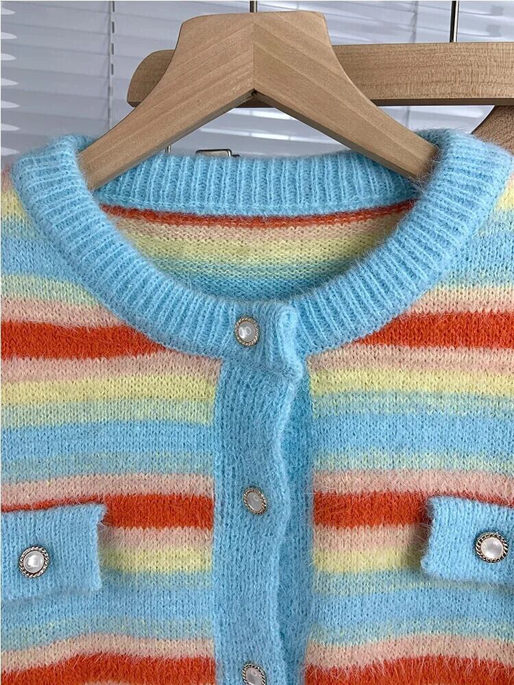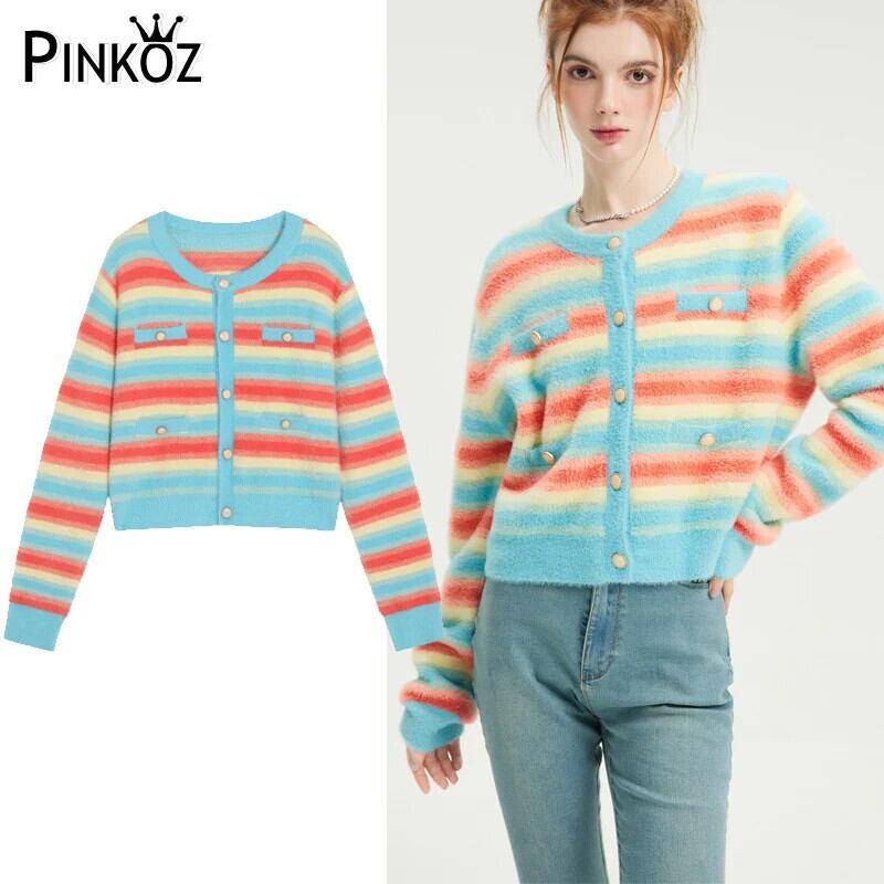 Pinkoz ブルーストライプ O ネックシングルブレストショートカーディガンニットジャケット春秋カジュアル若い甘いカーディガンファッション ピンク 大人ガーリー スウィート キュート スプリング 春物 Oネック