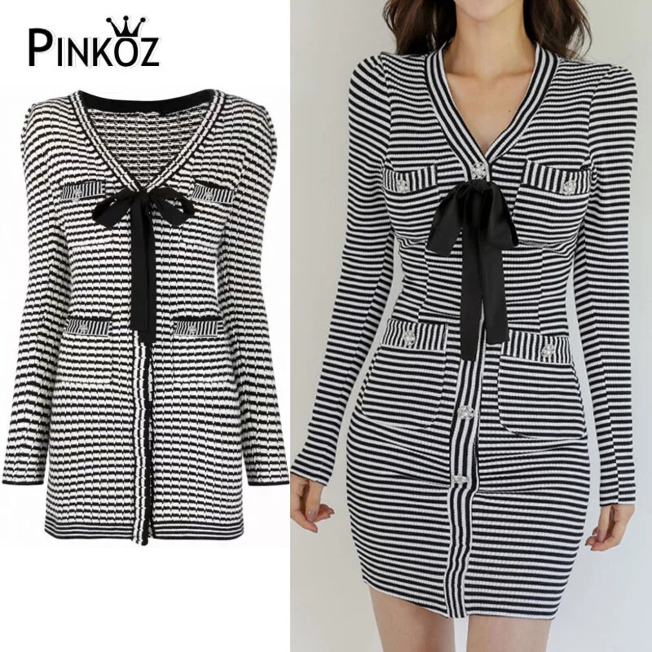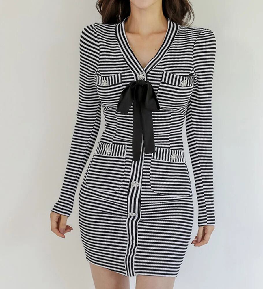 Pinkoz 黒、白ストライプ v ネック長袖秋冬ミニドレスフラワーボタンシングルブレストエレガントショートドレス ロング ピンク ホワイト ブラック オータム 秋物 ウィンター 冬物 Vネック フラワーデザイン