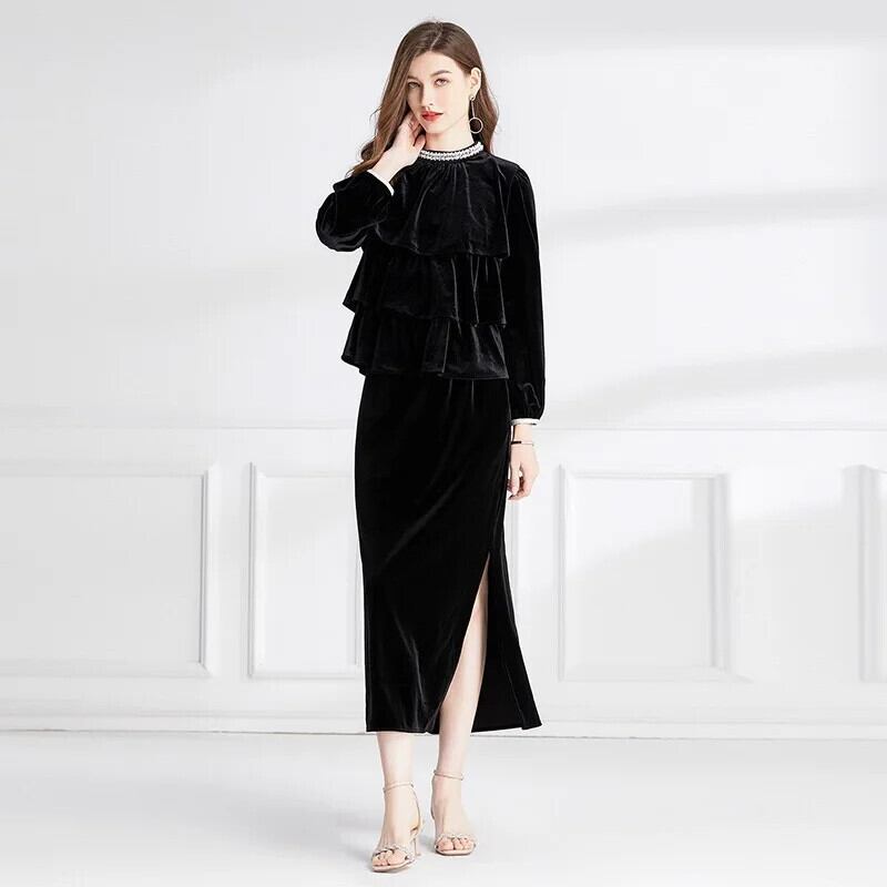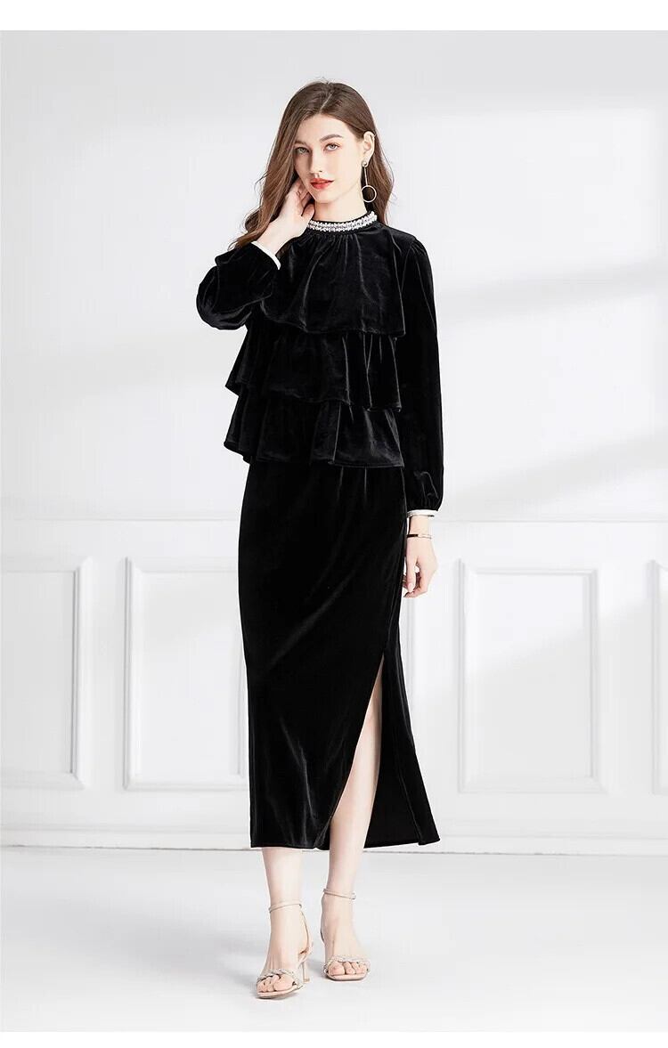 Pinkoz 2 個セット黒ビーズ o ネックフリルベルベット秋冬トップスプルオーバーミディペンシルスカートヴィンテージスーツ ピンク ブラック ラッフル オータム 秋物 ウィンター 冬物 Oネック ビンテージ