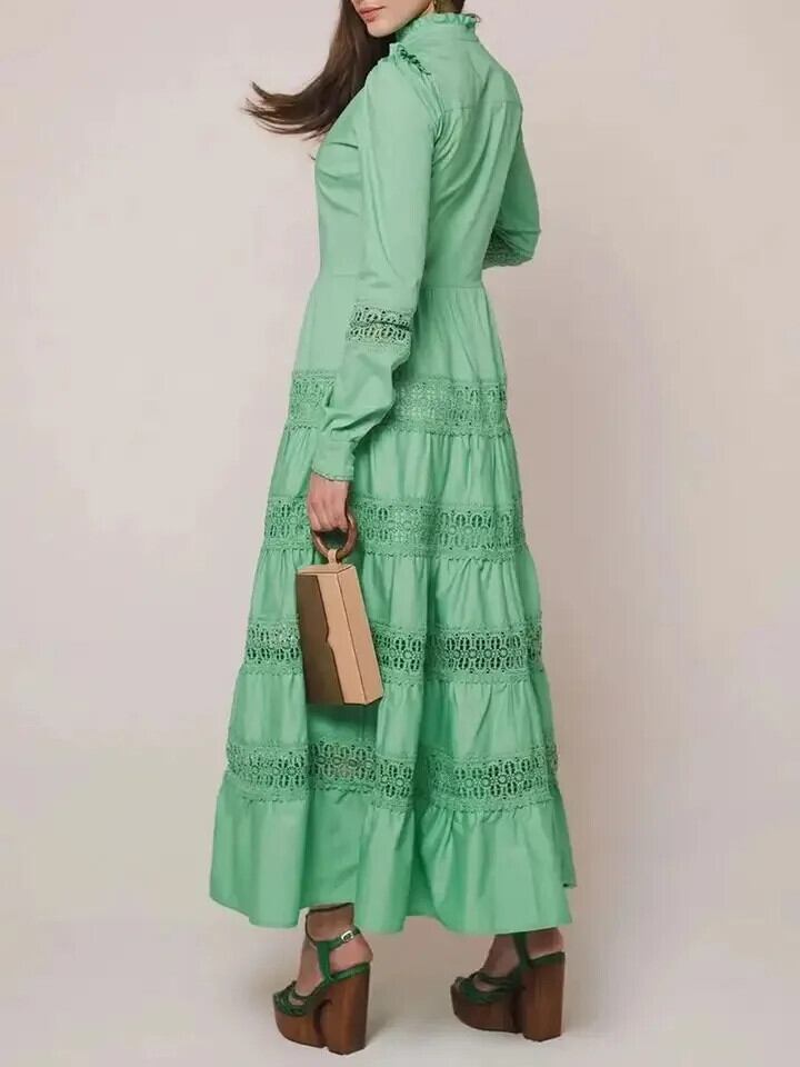 Pinkoz デザイナー滑走路スタイリッシュグリーンパッチワークレース高級シングルブレストマキシドレスヴィンテージ春ローブ ピンク スプリング 春物 ビンテージ