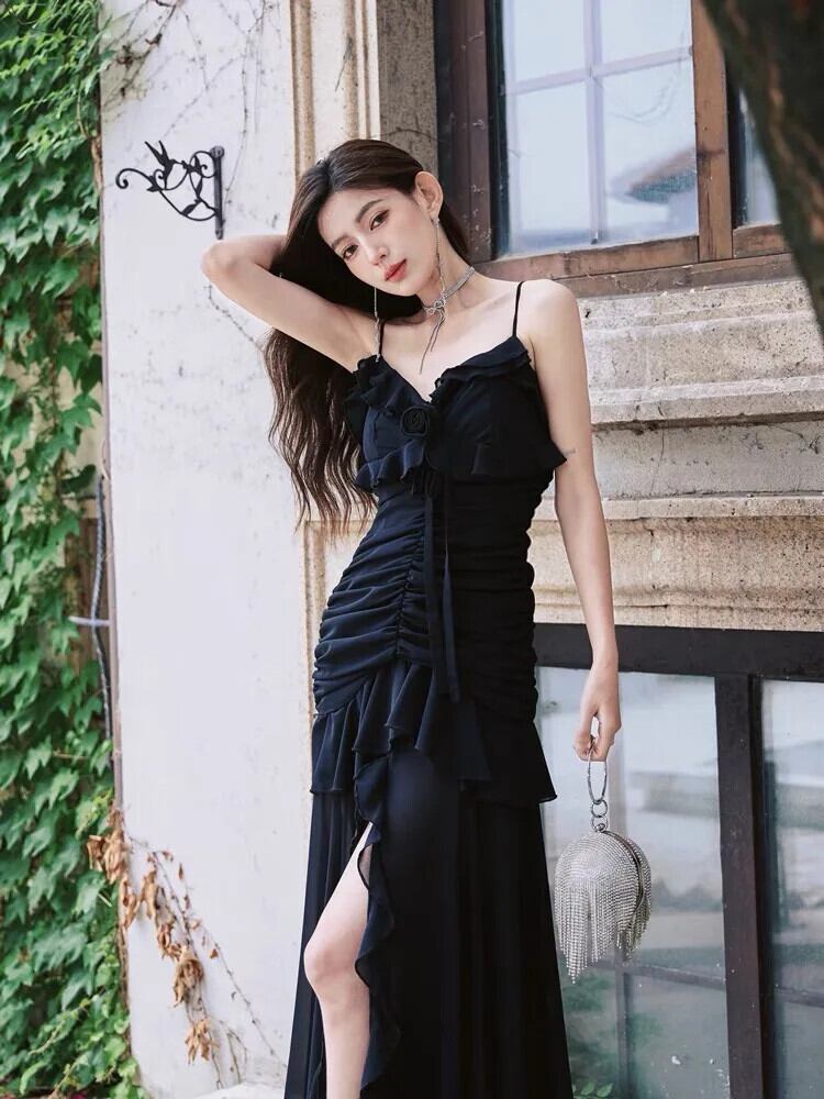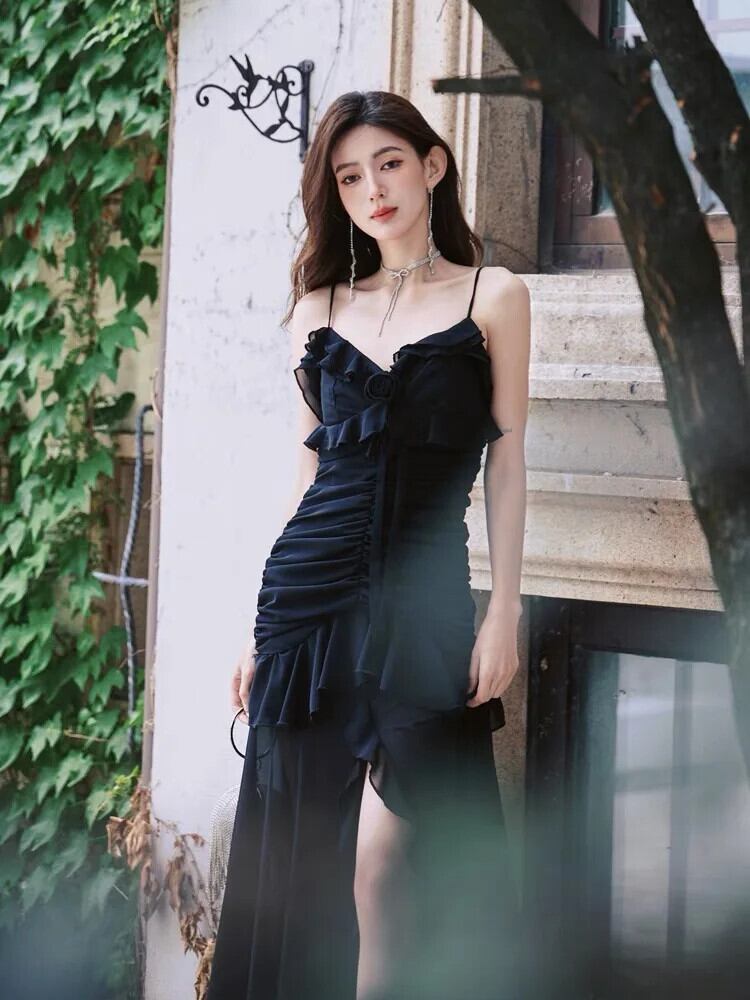 Pinkoz 滑走路デザイナースタイリッシュピンクスパゲッティストラップフラワーアップリケマキシフリルぬるぬるシャーリングナイトドレスvestidos ラッフル フラワーデザイン