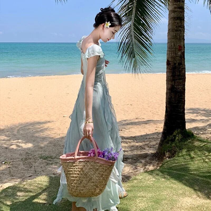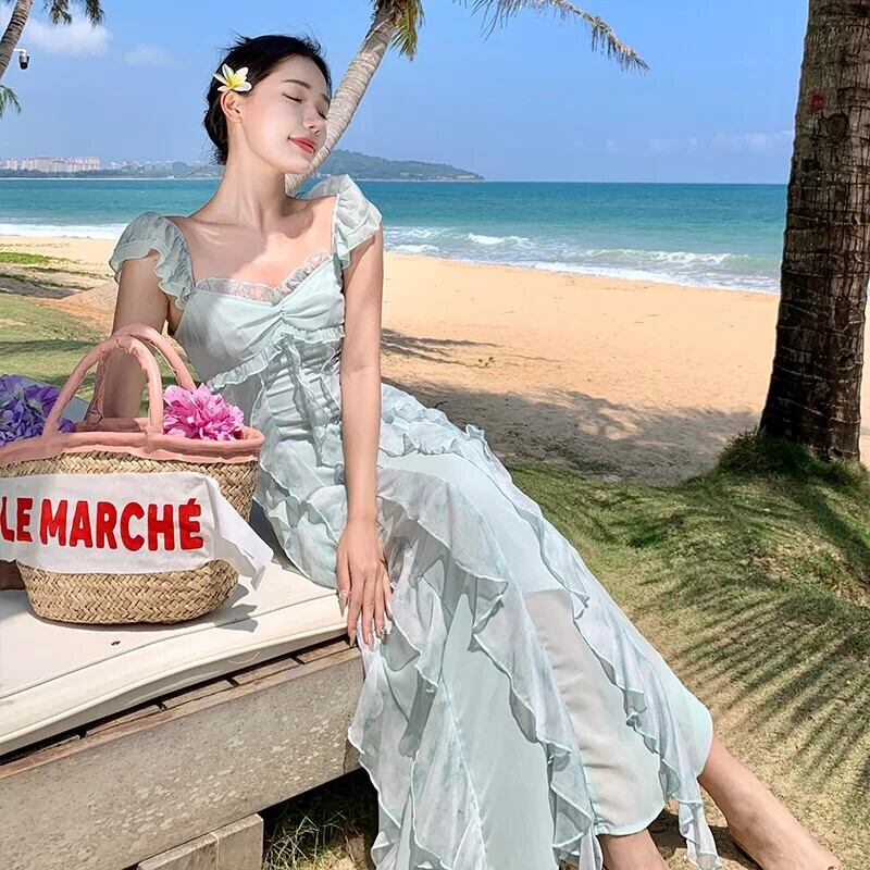 Pinkoz 春夏ライトブルーミディフリルドレススパゲッティストラップノースリーブロングぬるぬる A ライン Vestidos ローブ ピンク ラッフル スプリング 春物 サマー 夏物 Aライン