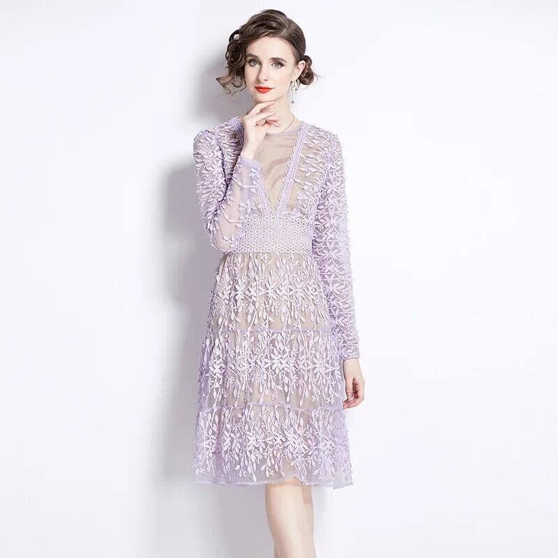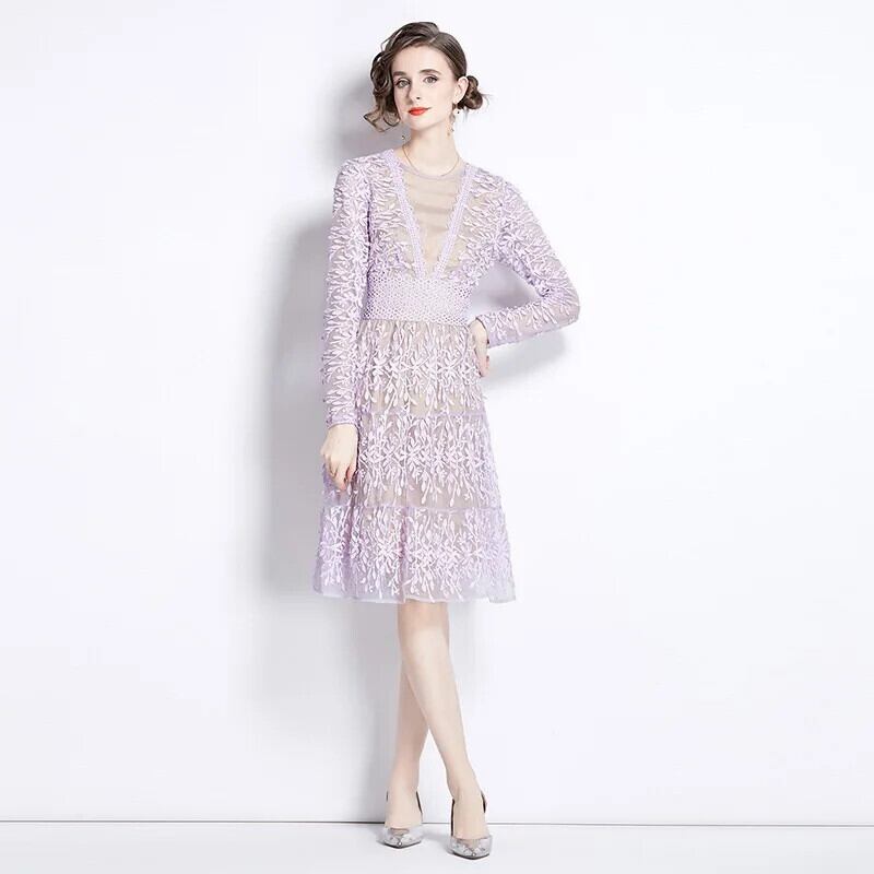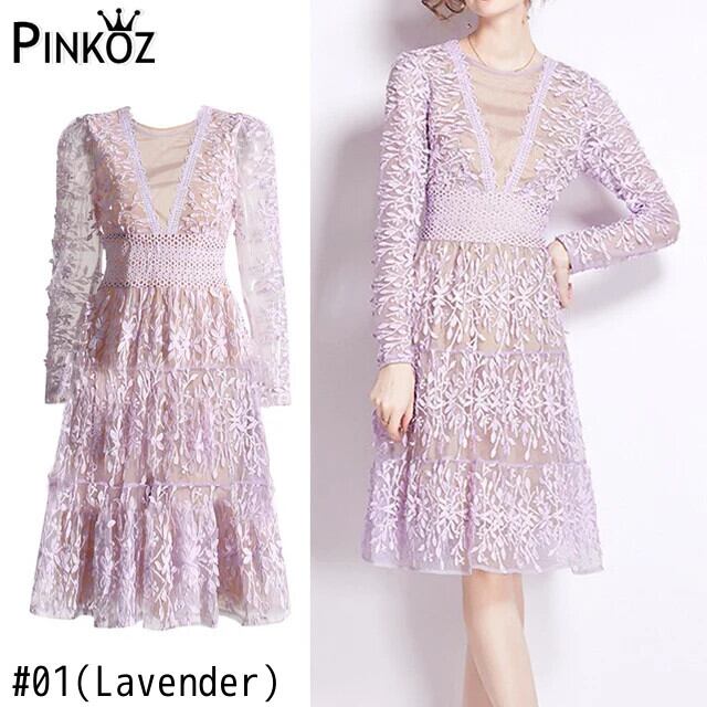 Pinkoz バイオレット膝丈 o ネック高級レースドレスパーティーエレガント夜ファッションドレスvestidosローブ ピンク Oネック