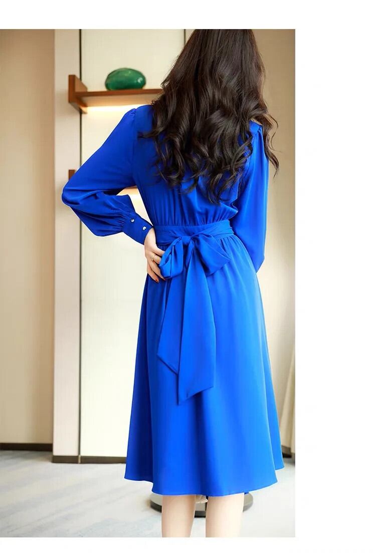 Pinkoz 滑走路デザイナーブルーレースアップ V ネックハイウエストエレガントスプリットミディドレスエレガントオフィスレディファム Vestidos ハイウェスト ピンク Vネック フェミニン 会社 学校 通勤や通学にも