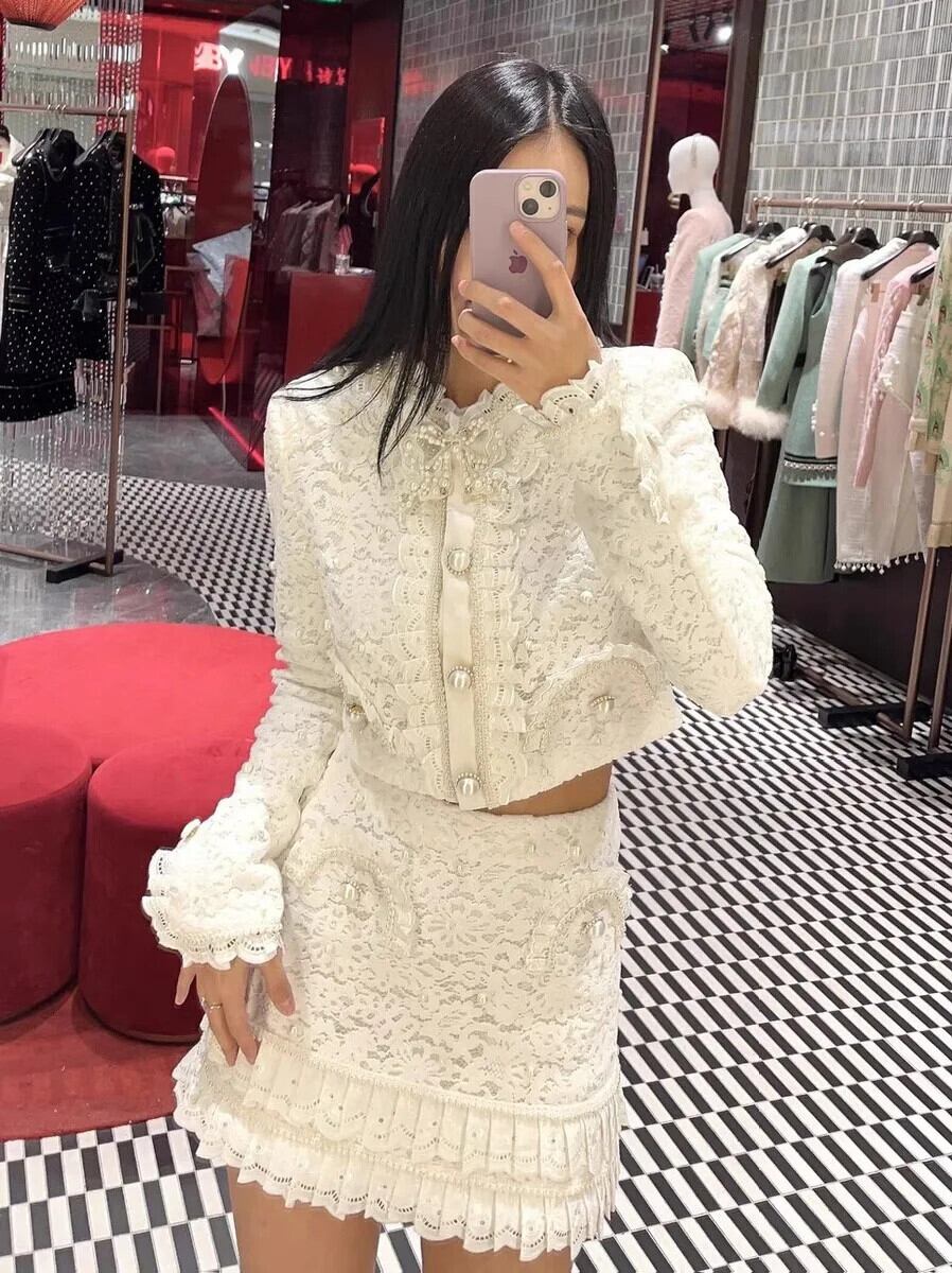 Pinkoz ファッションデザイナースタイリッシュ白高級刺繍ビーズボタンジャケットショートミニペンシルスカート 2 枚セット z ピンク ホワイト
