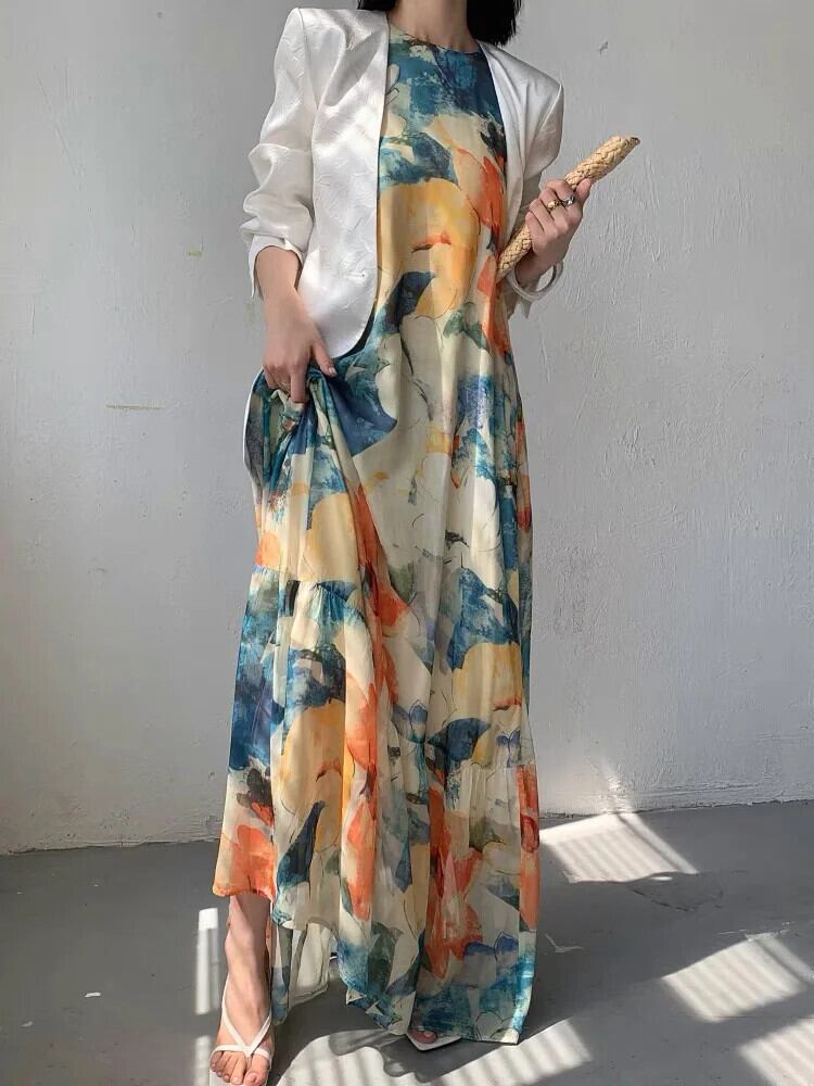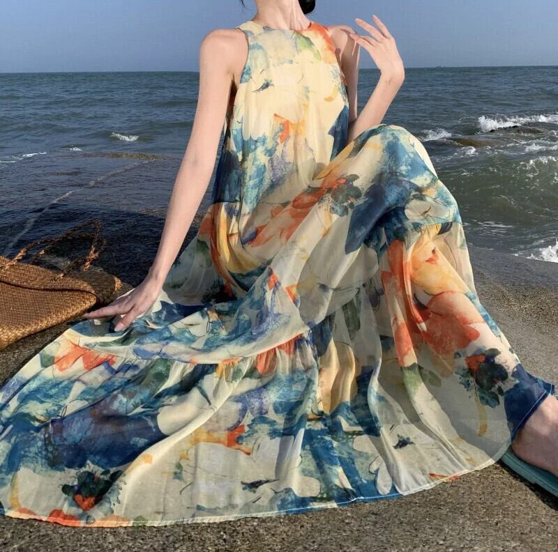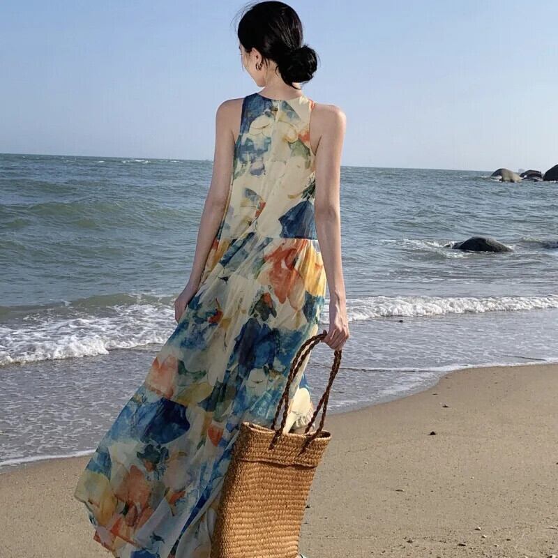 Pinkoz 夏タンクノースリーブ花柄プリント o ネックルーズロングドレスビーチカジュアルマキシ Vestidos ローブデ mujer ピンク サマー 夏物 Oネック