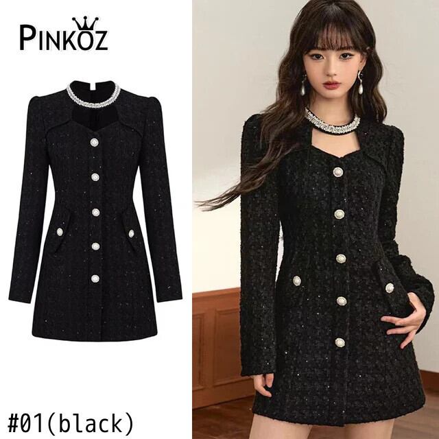 Pinkoz 秋冬ミニペンシルドレスビーズ黒パーティーアウトツイードカジュアルエレガントドレス Vestidos ローブデ ピンク ブラック オータム 秋物 ウィンター 冬物