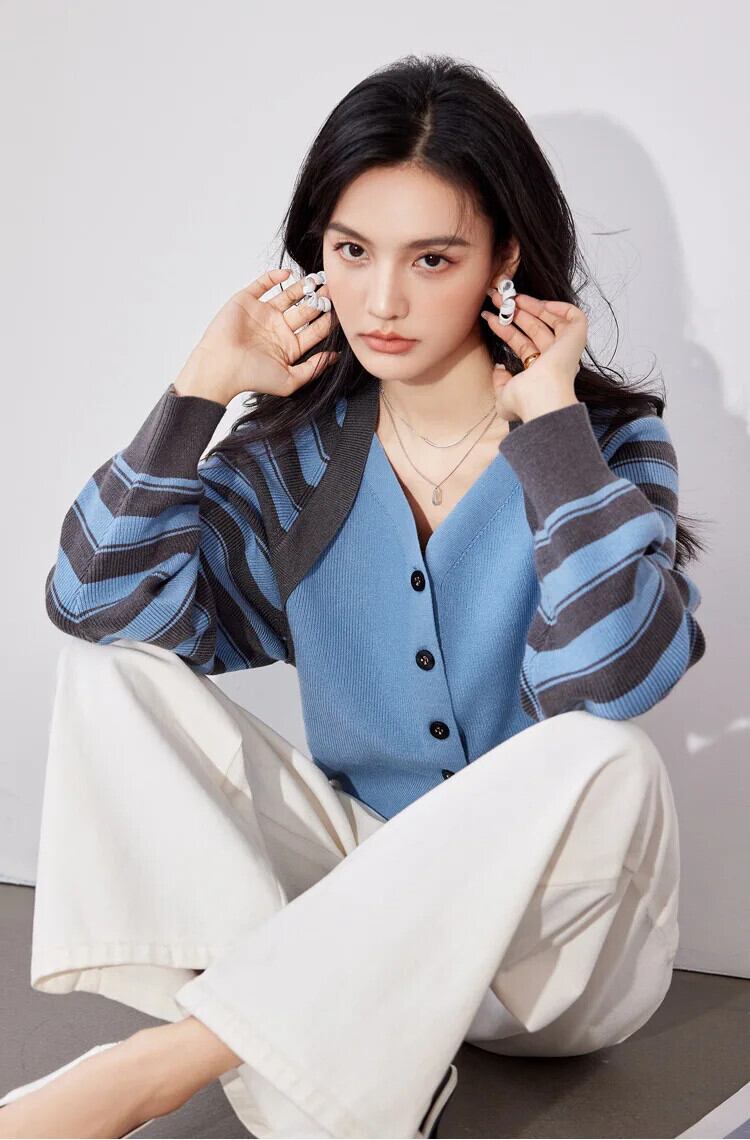 Pinkoz ファッション新ブルーストライプニットトップス V ネックカジュアルエレガントスタイリッシュカーディガンヴィンテージ ピンク Vネック ビンテージ