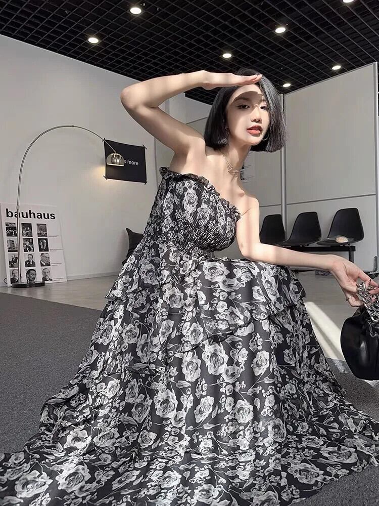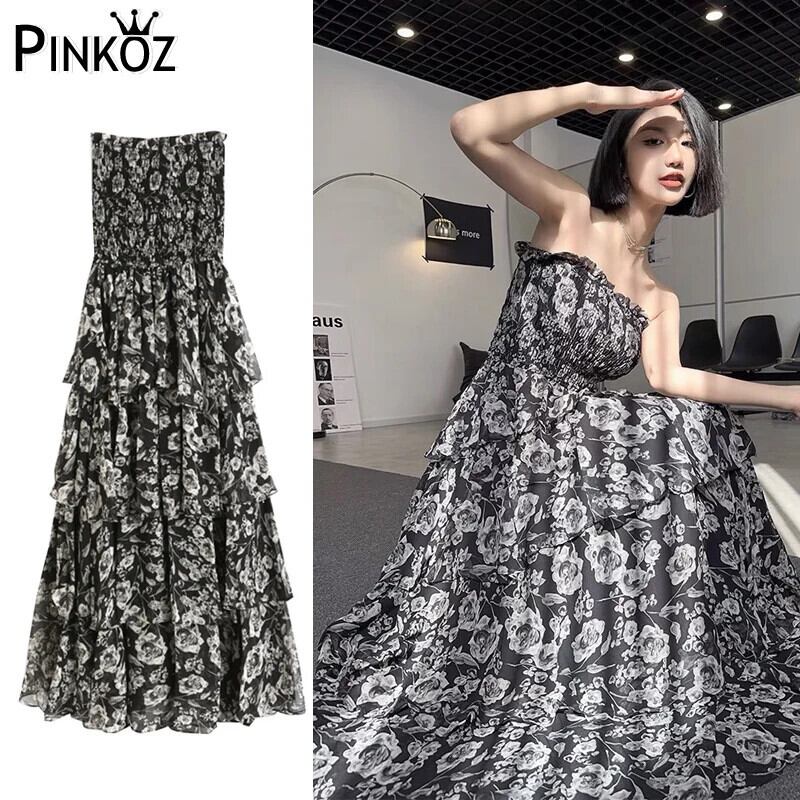 Pinkoz 黒ストラップレス弾性ぬるぬる A ラインマキシドレス春夏カジュアル若いゴシックロングドレスファッション Vestidos ピンク ブラック エラスティック 伸縮 スプリング 春物 サマー 夏物 Aライン