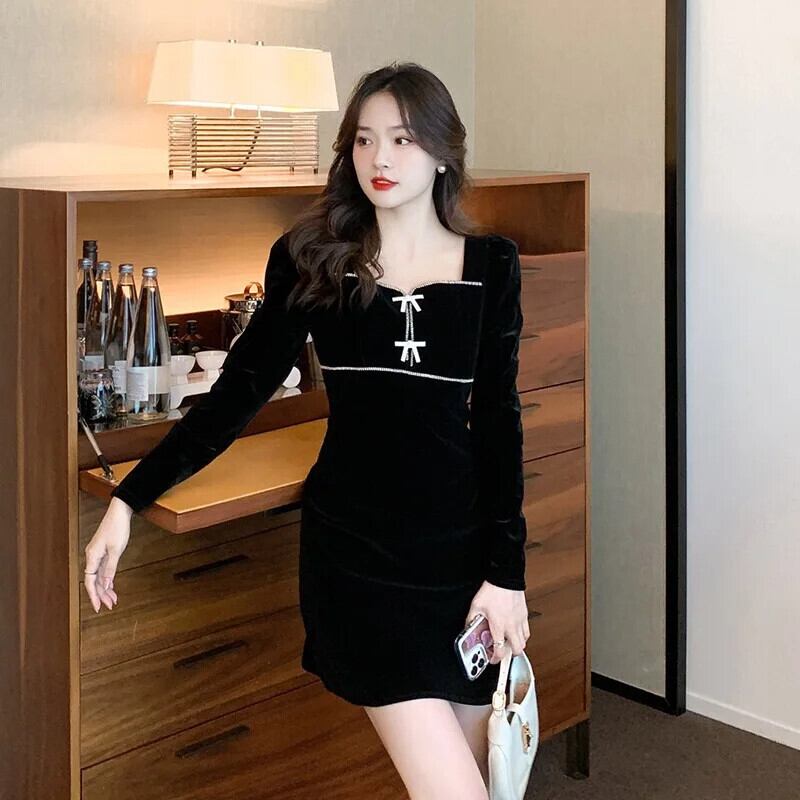 Pinkoz ミニドレス黒ベルベットスクエアカラークリスタルリボン黒ドレスゴシックエレガント春秋ショート Vestidos ピンク ブラック スプリング 春物 オータム 秋物 スクウェア