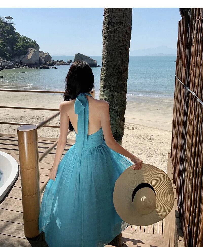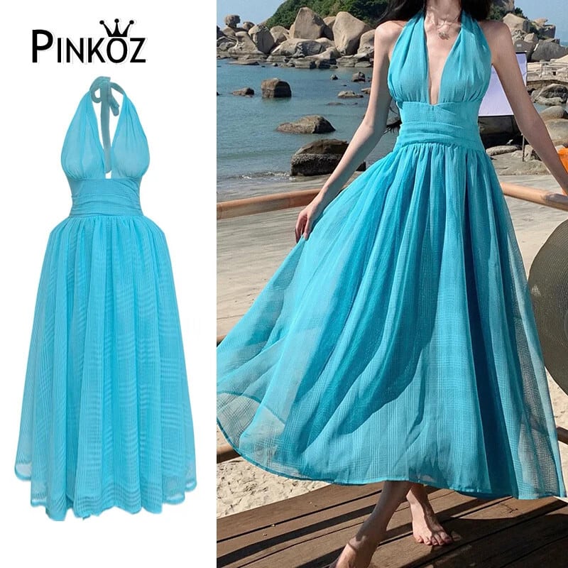 Pinkoz ランウェイデザイナーファッションブルーマリリンモンローホルターネック深い v ネックノースリーブ春夏ミディドレスvestidos 弓 ピンク リボン スプリング 春物 サマー 夏物 Vネック