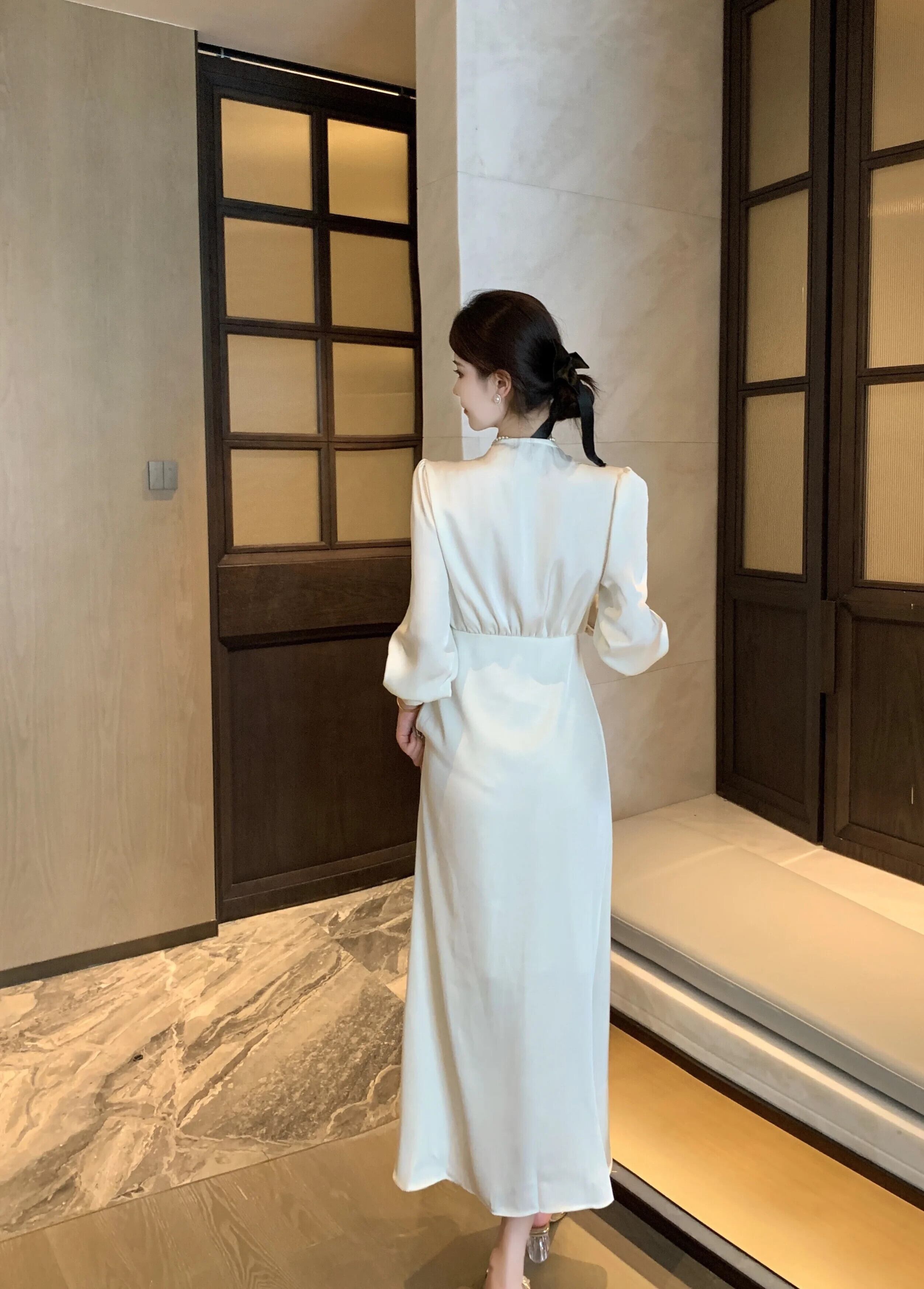 Pinkoz エレガントホワイト v ネックパッチワークレースクリスタルミディドレス春秋新ぬるぬるシックローブデ mujer za ピンク スプリング 春物 オータム 秋物 Vネック