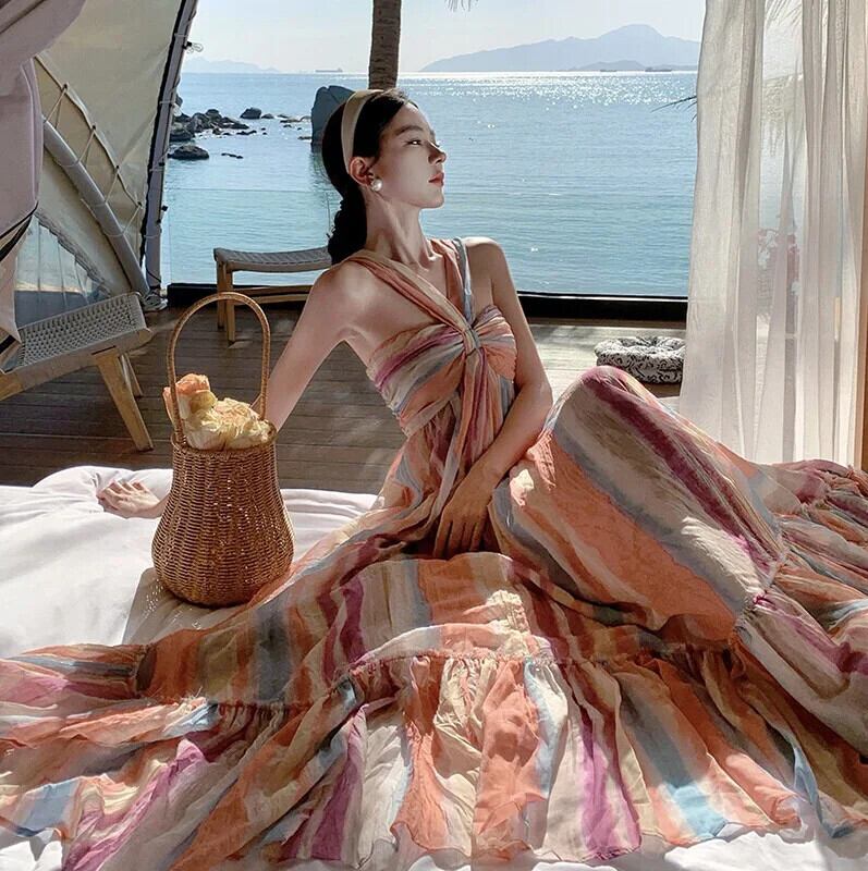 Pinkoz 夏休みストライプマキシドレスノースリーブハイウエストファッション衣類若いヒットカラービーチvestidosヴィンテージ ハイウェスト ピンク サマー 夏物 ビンテージ
