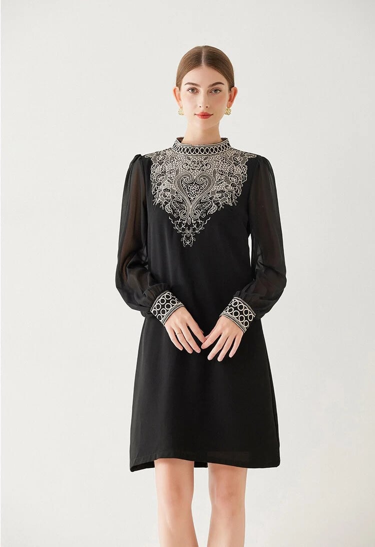Pinkoz 黒スタンドカラー刺繍膝丈ドレス長袖夏春ドレスエレガント OL vestidos ロング ピンク ブラック スプリング 春物 サマー 夏物