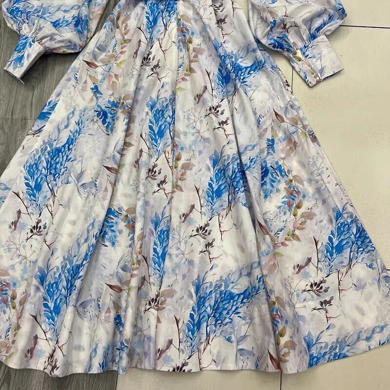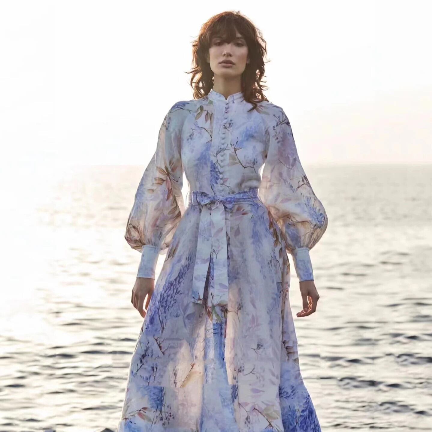 Pinkoz シングルブレストミディドレス花柄スタンドカラーランタンスリーブファッションホリデーシックサッシレースアップベストローブ ピンク