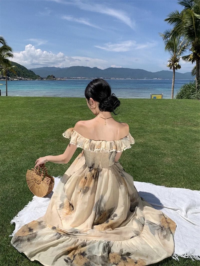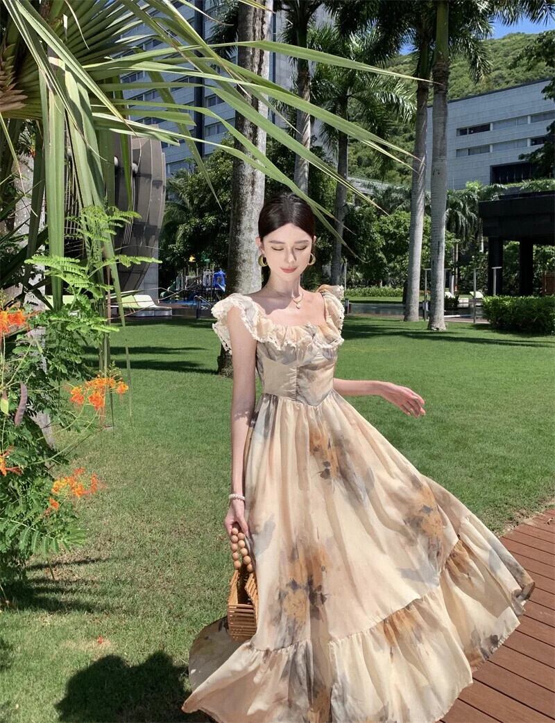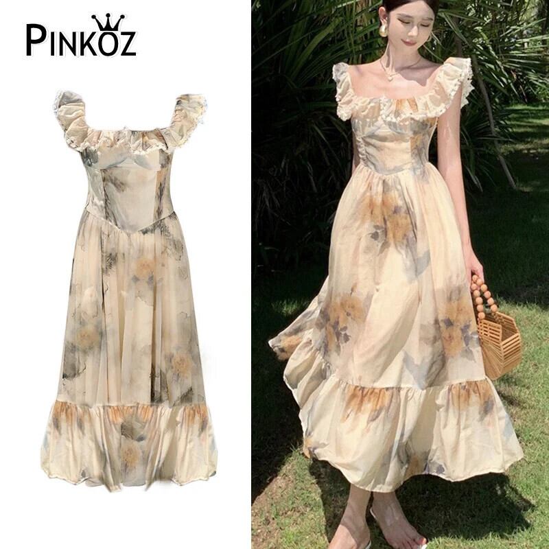 Pinkoz ホリデーシック花柄プリントノースリーブミディ A ラインドレスファッション衣類ヴィンテージフレンチ Vestidos ローブデムジェ ピンク Aライン ビンテージ