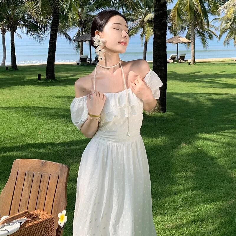 Pinkoz オフショルダーファッションホワイトドレススラッシュネックフリルポルカドットレースハイワーシト A ラインシックローブデムジェパーティードレス ピンク ラッフル Aライン