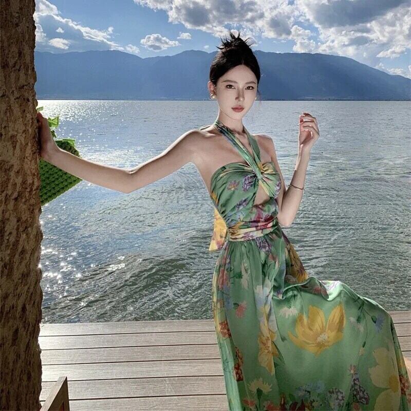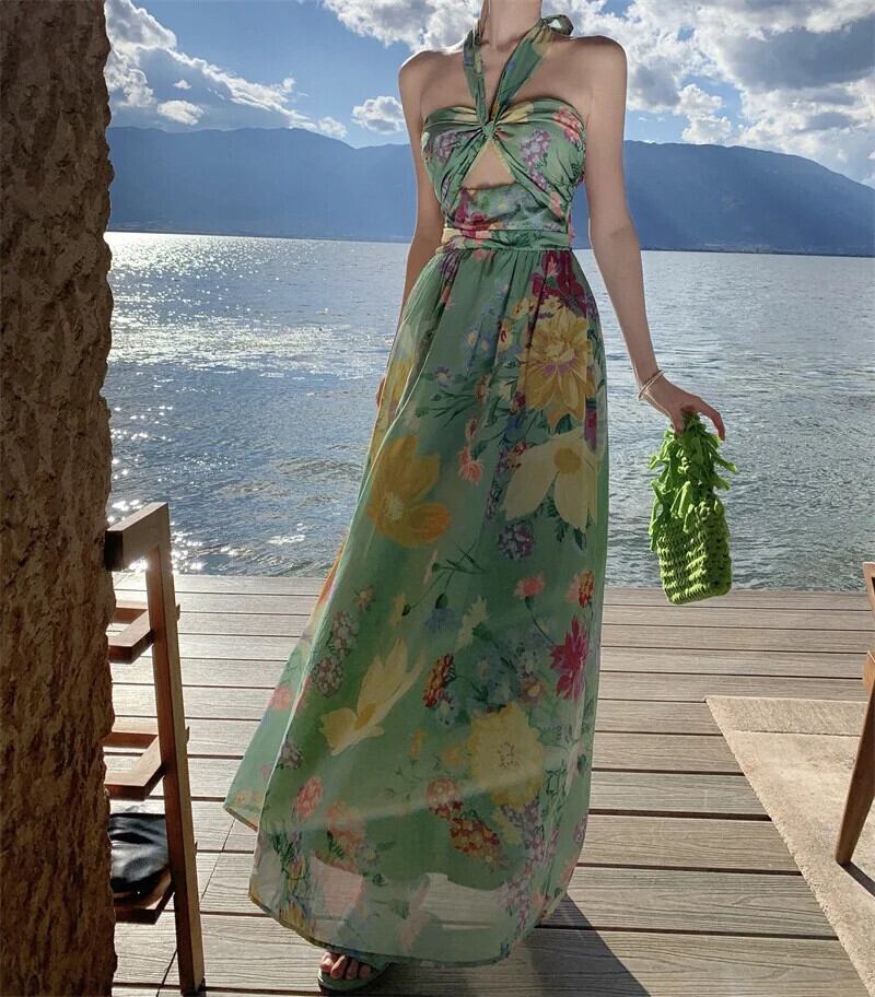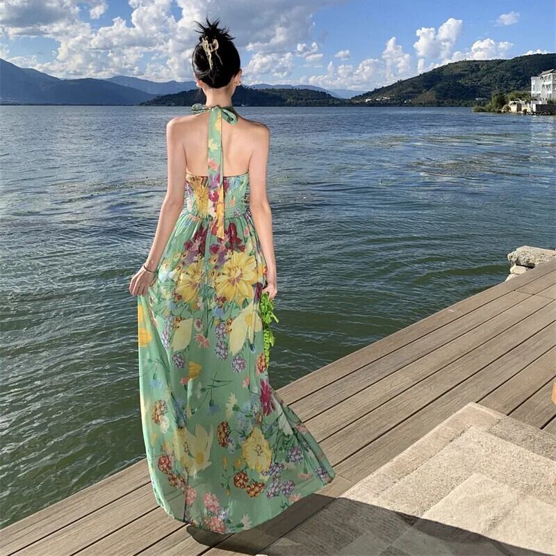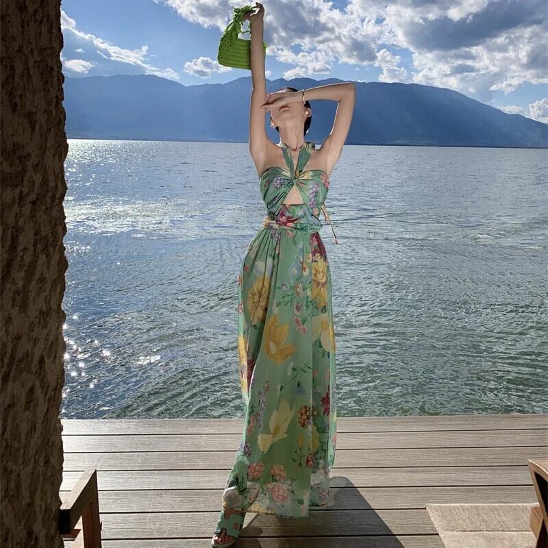 Pinkoz デザイナーホルターバックレス花柄プリントタンクノースリーブファッションホリデーシックビーチ Vestidos ピンク