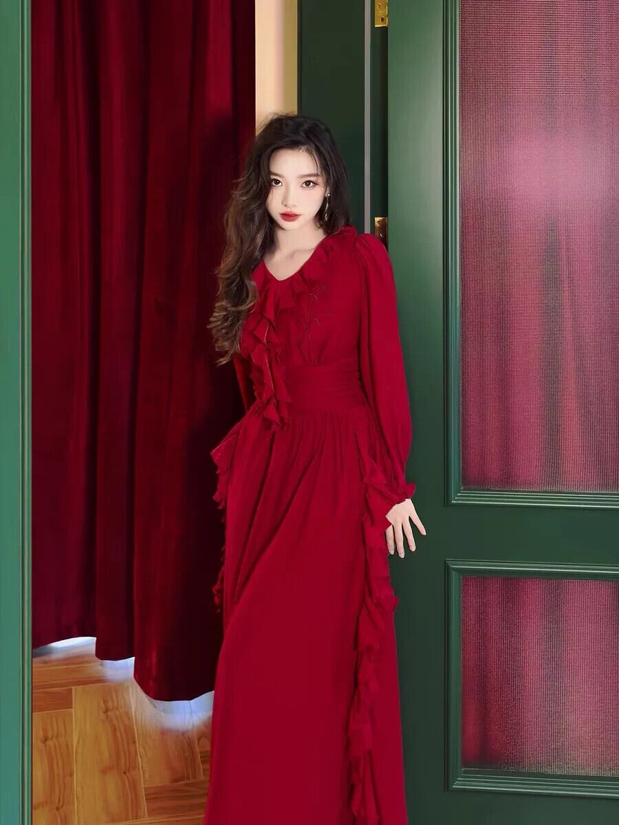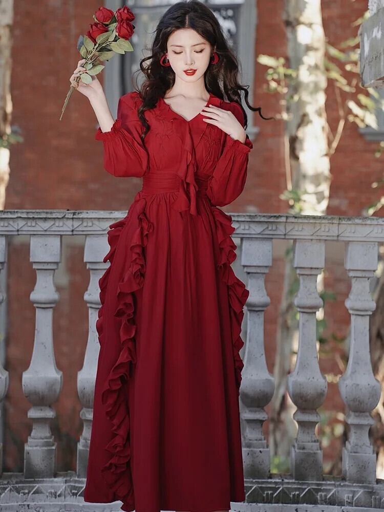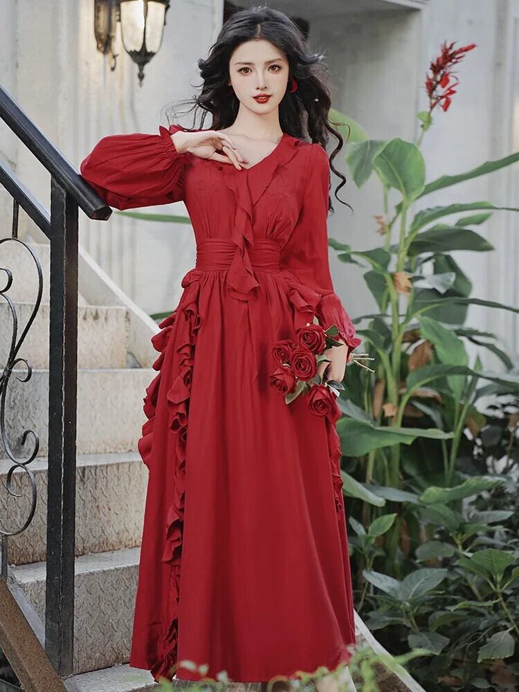 Pinkoz ヴィンテージ Vestidos フリル V ネックハイウエスト長袖 A ラインフレンチシック春秋ドレス自由奔放生きるローブ ハイウェスト ロング ピンク ラッフル スプリング 春物 オータム 秋物 Vネック Aライン ビンテージ
