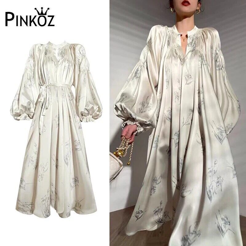 Pinkoz ヴィンテージ Vestidos ランタンスリーブミディサテン春新ファッションルーズサイズドレスレースアップ花柄ローブ ピンク スプリング 春物 ビンテージ