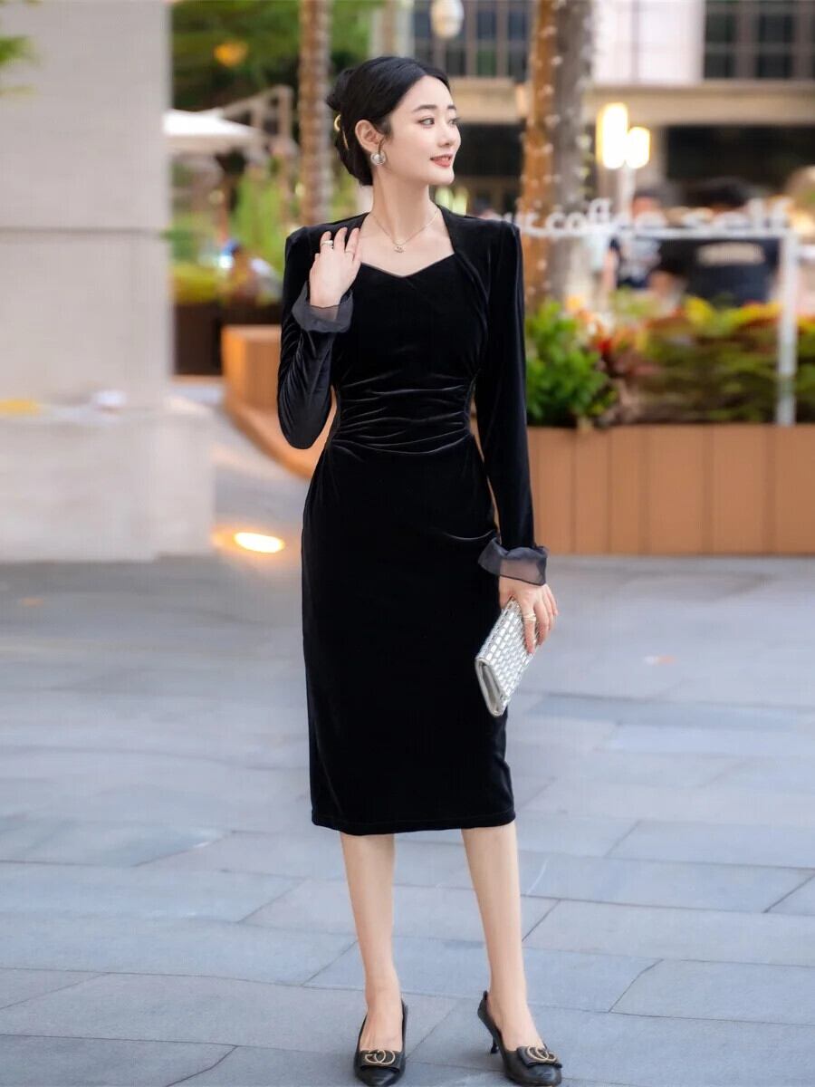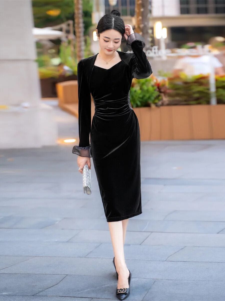 Pinkoz デザイナー黒ペンシルミディドレススクエアカラーフレアスリーブパッチワークレースベルベット弾性パーティーエレガントナイトvestidos ピンク ブラック エラスティック 伸縮 スクウェア
