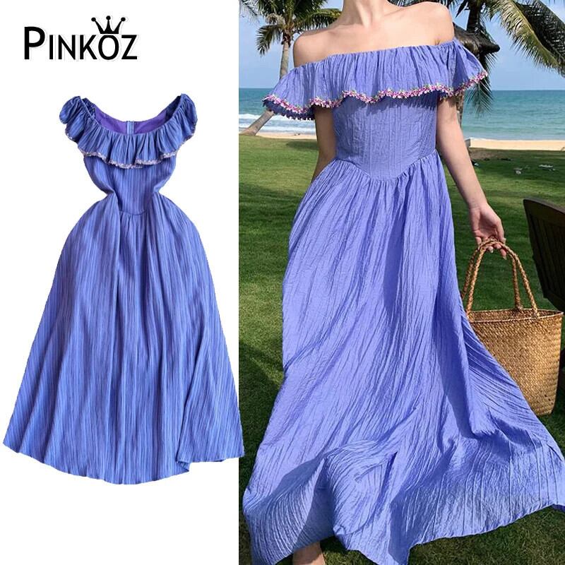 Pinkoz パープルミディドレススラッシュネック春夏ヴィンテージビクトリア朝ハイストリートシックドレスローブデムジェ ピンク スプリング 春物 サマー 夏物 ビンテージ
