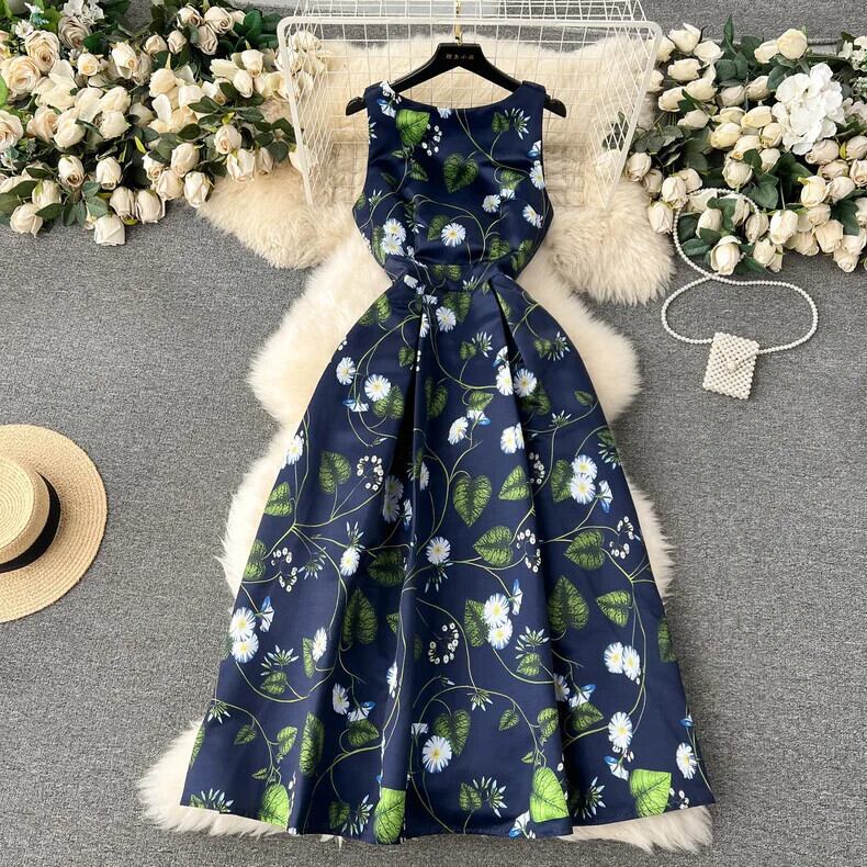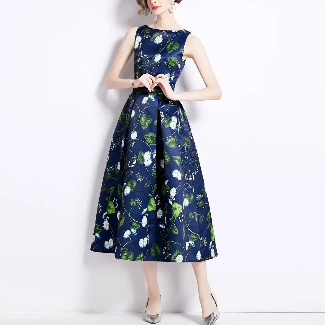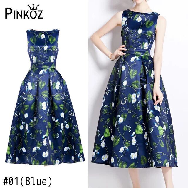 Pinkoz ダークブルー花柄タンクノースリーブミディ A ラインエレガントドレスファッション O ネック春夏ヴィンテージパリローブ ピンク スプリング 春物 サマー 夏物 Oネック Aライン ビンテージ