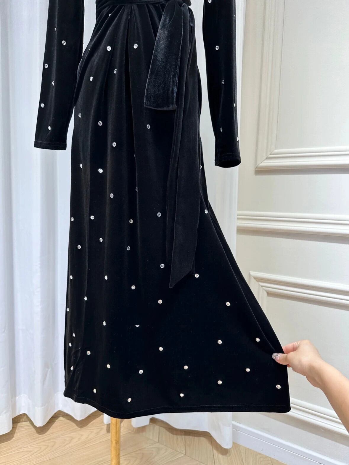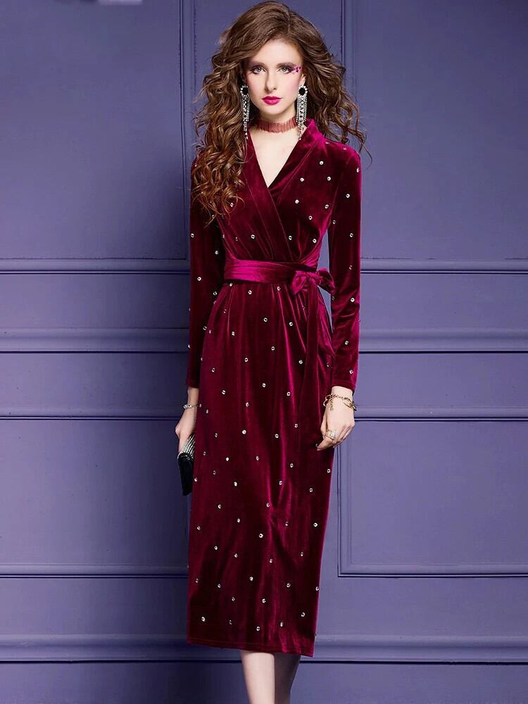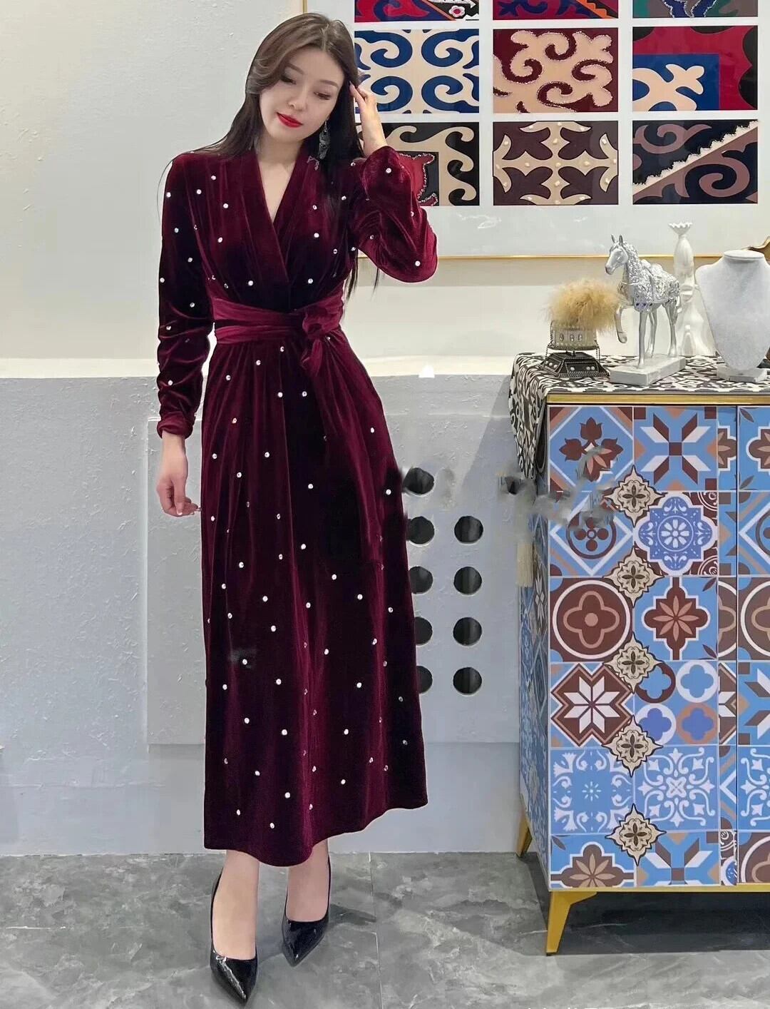 Pinkoz 滑走路デザイナー v ネック秋冬ミディドレスブルゴーニュレッドダイヤモンドビーズ高級ドレスヴィンテージvestidos ピンク オータム 秋物 ウィンター 冬物 Vネック ビンテージ
