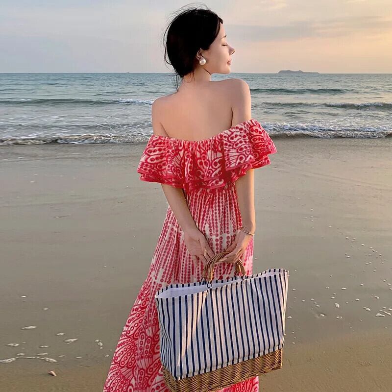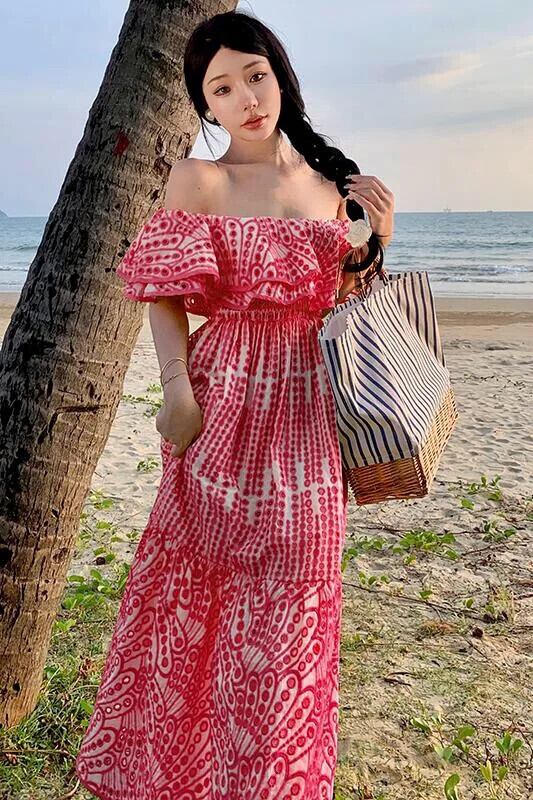 Pinkoz 滑走路デザイナースラッシュネックフリルレースアウトミディドレス高級レッドパーティードレスvestidos ピンク ラッフル