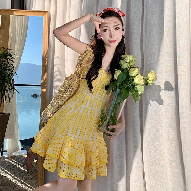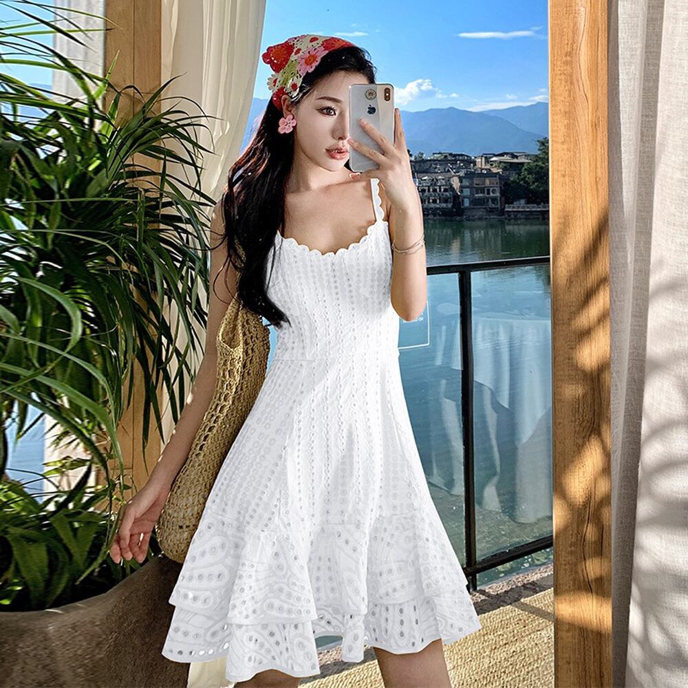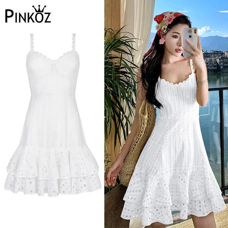 Pinkoz 春夏新ファッション白いレースショートドレスぬるぬる高級刺繍ミニドレスキャミソール ピンク ホワイト スプリング 春物 サマー 夏物