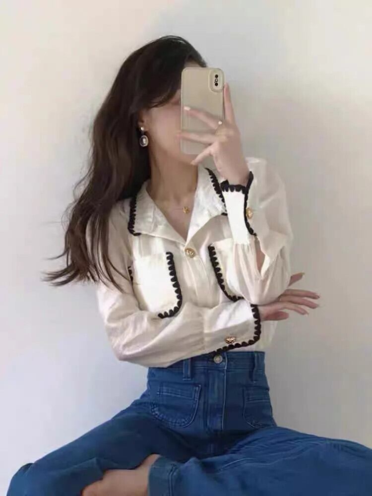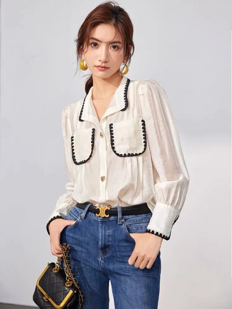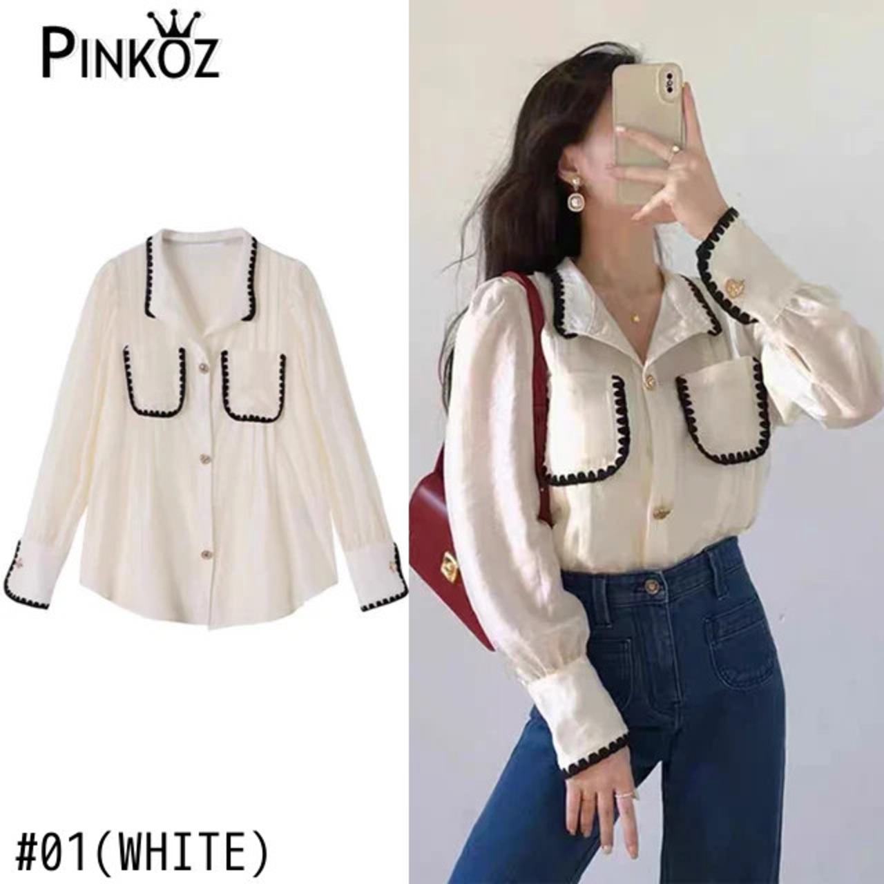 Pinkoz デザイナー白高級エレガント白シャツファムオフィスレディ作業ポケットブラウスファッションシックトップス ピンク ホワイト フェミニン 会社 学校 通勤や通学にも