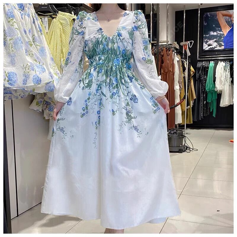 Pinkoz デザイナー v ネック緑白花柄マキシドレス長袖ファッションvestidos ヴィンテージローブ自由奔放生きる za ロング ピンク ホワイト Vネック グリーン ビンテージ