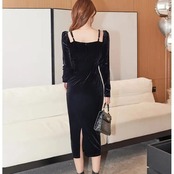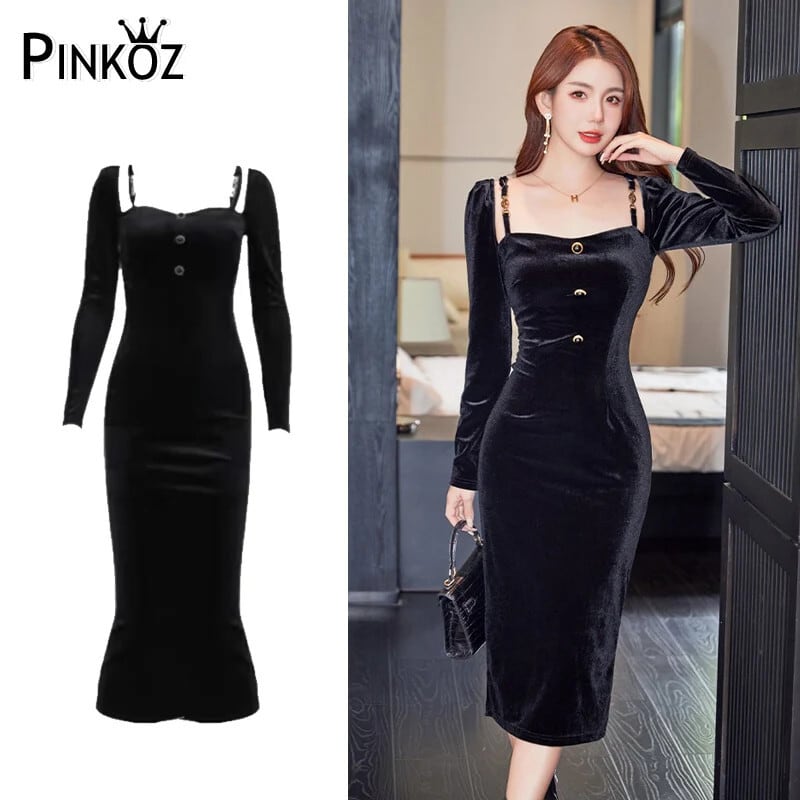 Pinkoz 滑走路デザイナー黒ベルベットミディぬるぬるドレススクエアカラーロングエレガント秋冬ドレスボタンvestidos ピンク ブラック オータム 秋物 ウィンター 冬物 スクウェア